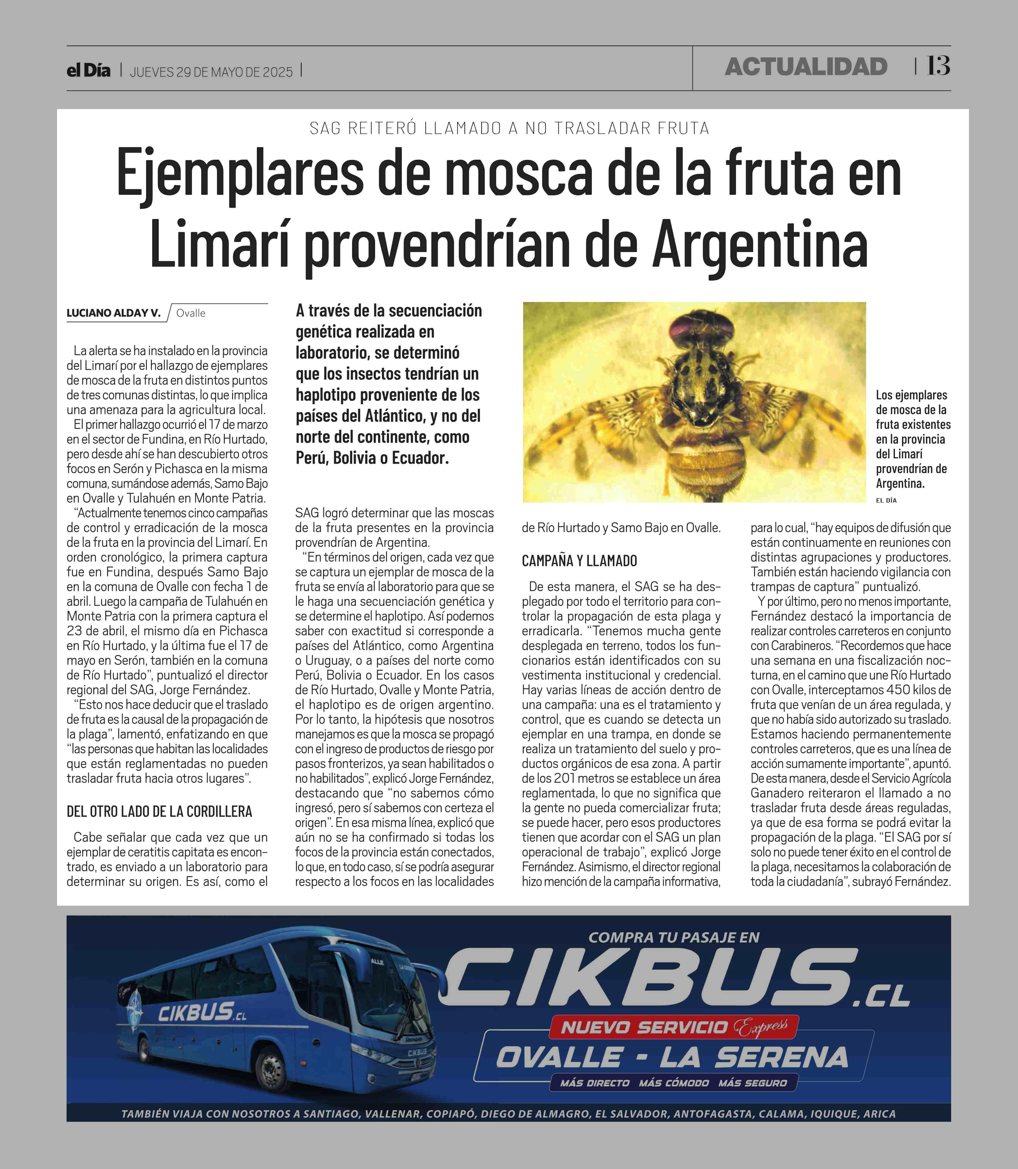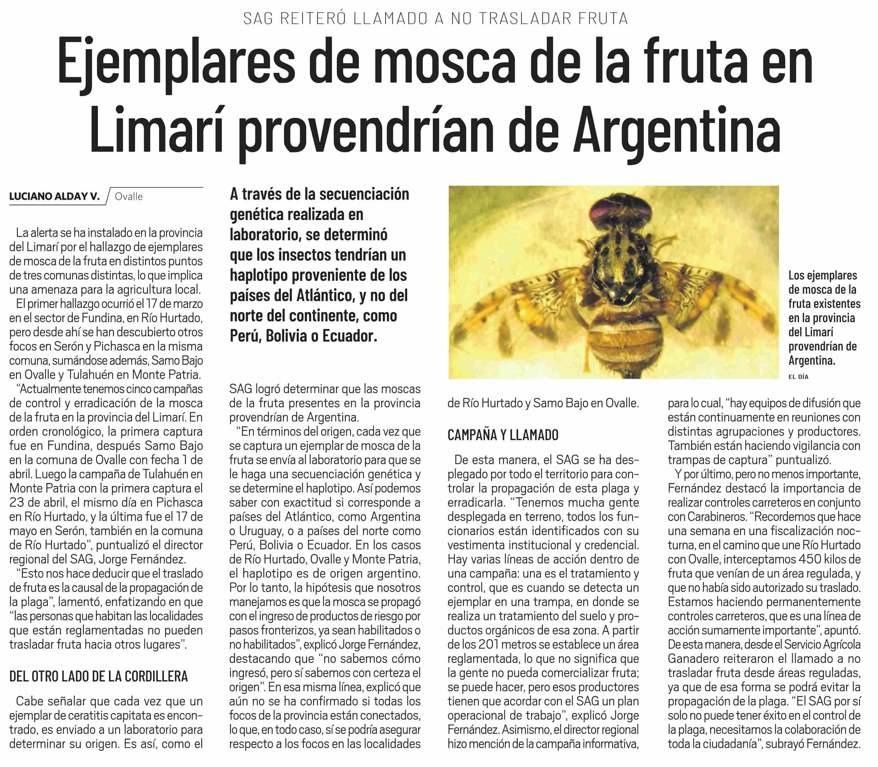 Ejemplares de mosca de la fruta en Limarí provendrían de Argentina 29-05-2025 El Día |