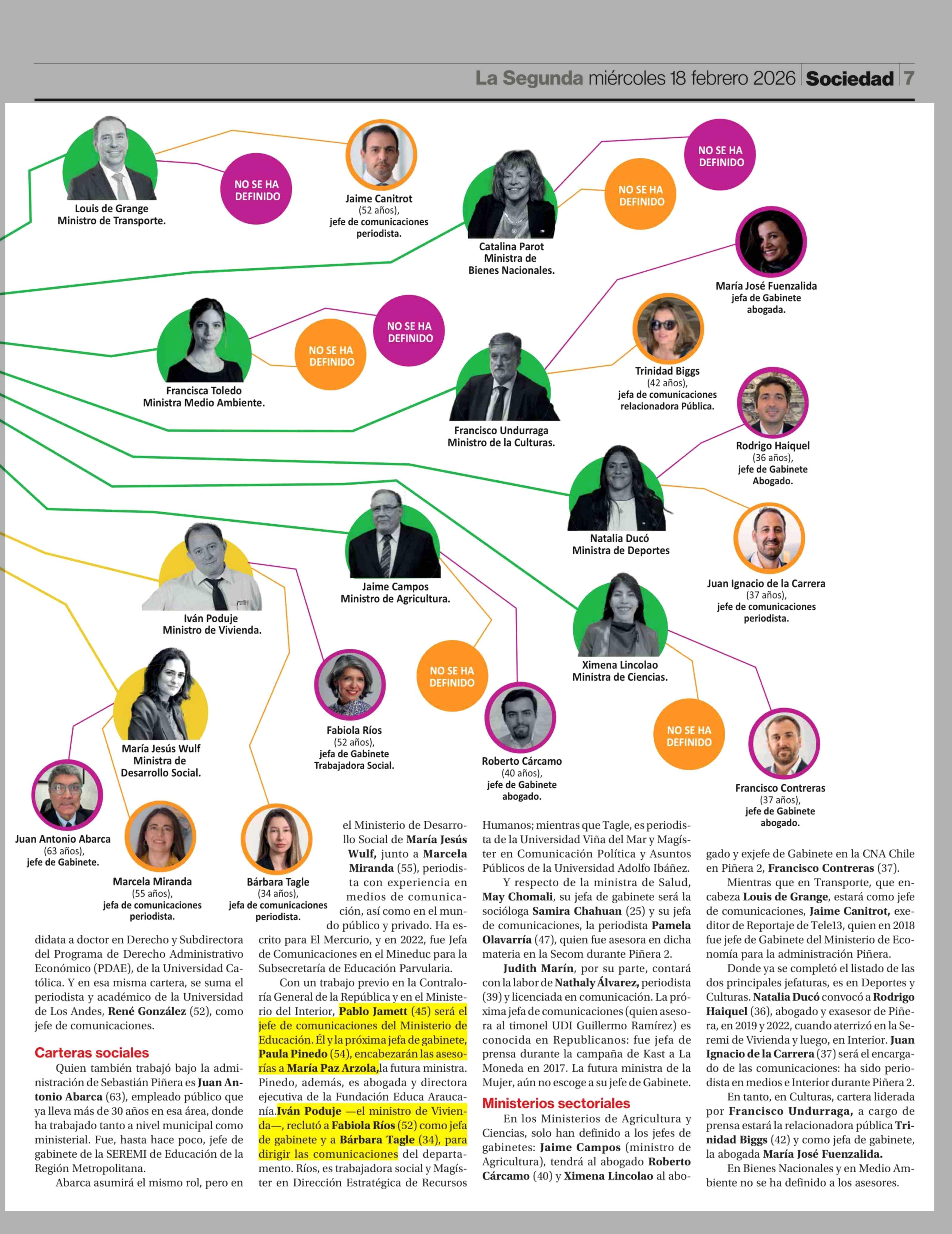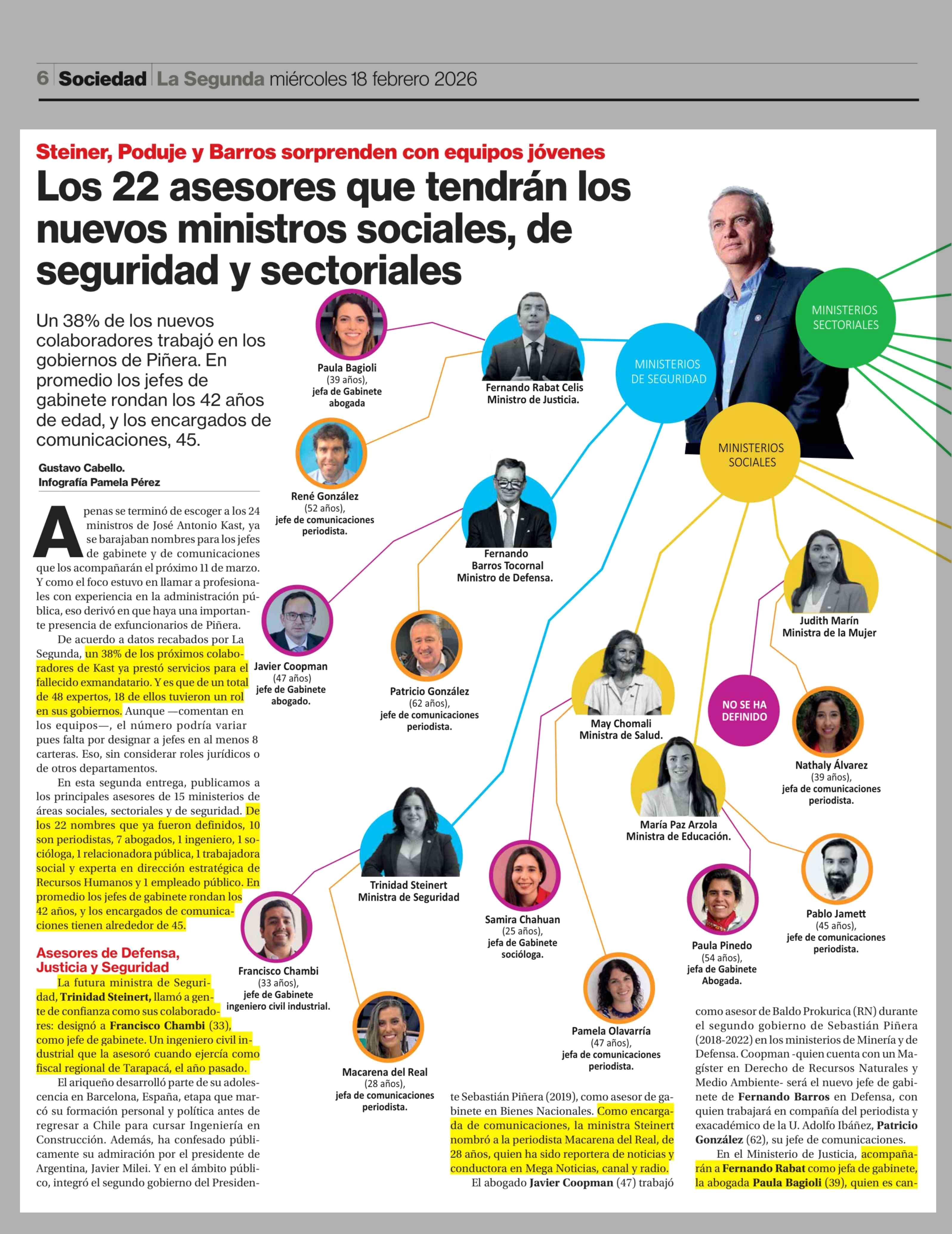 Los 22 asesores que tendrán los nuevos ministros sociales, de seguridad y sectoriales 18-02-2026 La Segunda |