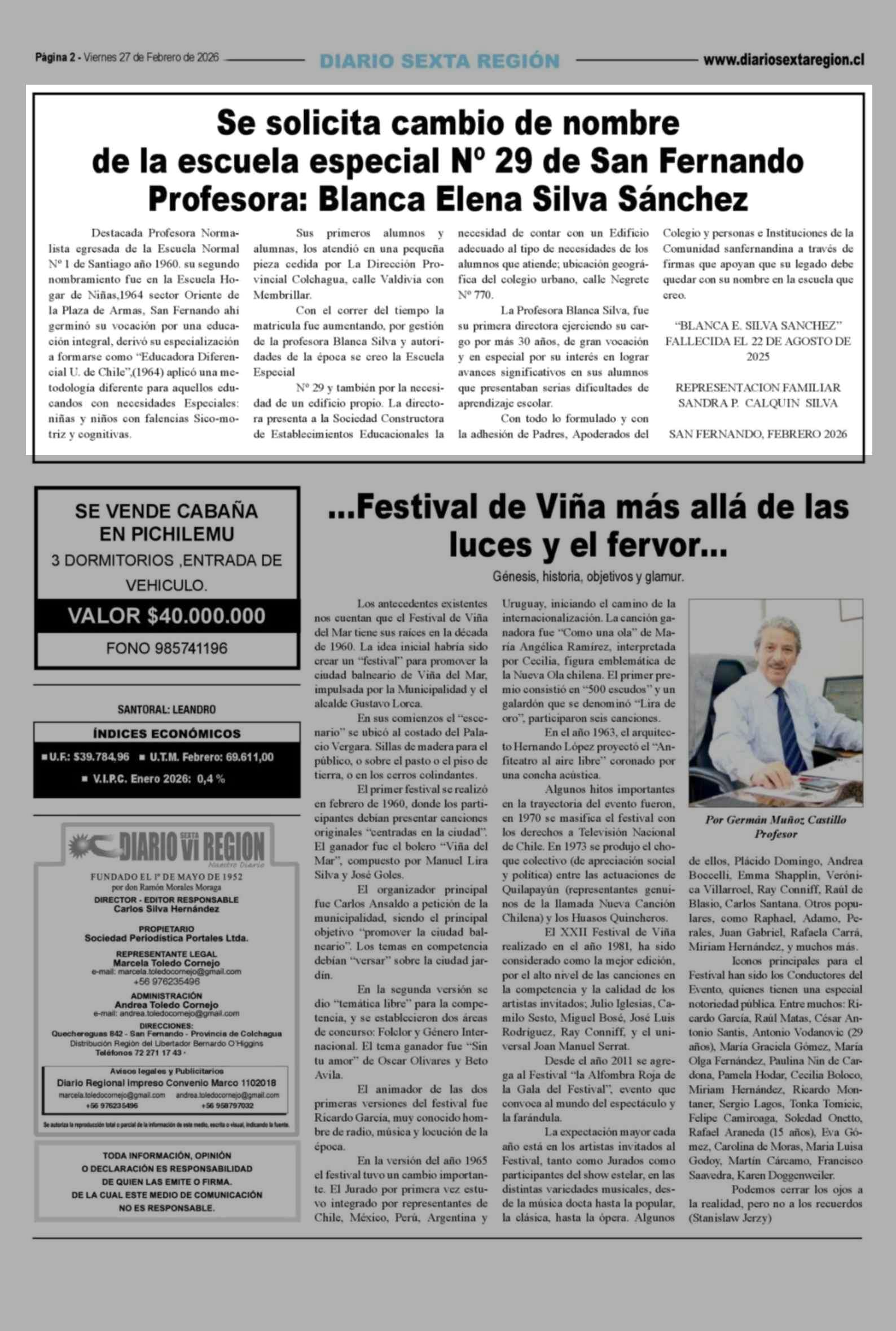 Se solicita cambio de nombre de la escuela especial Nº 29 de San Fernando Profesora: Blanca Elena Silva Sánchez 27-02-2026 Diario VI Región |