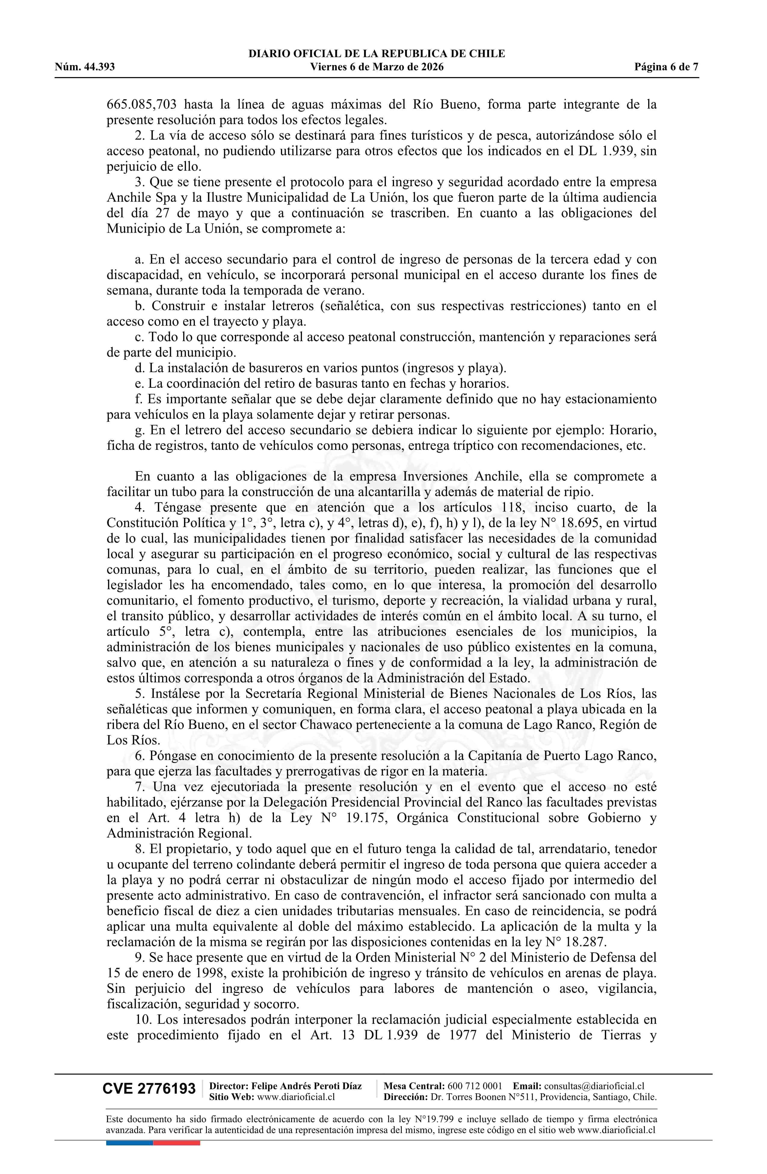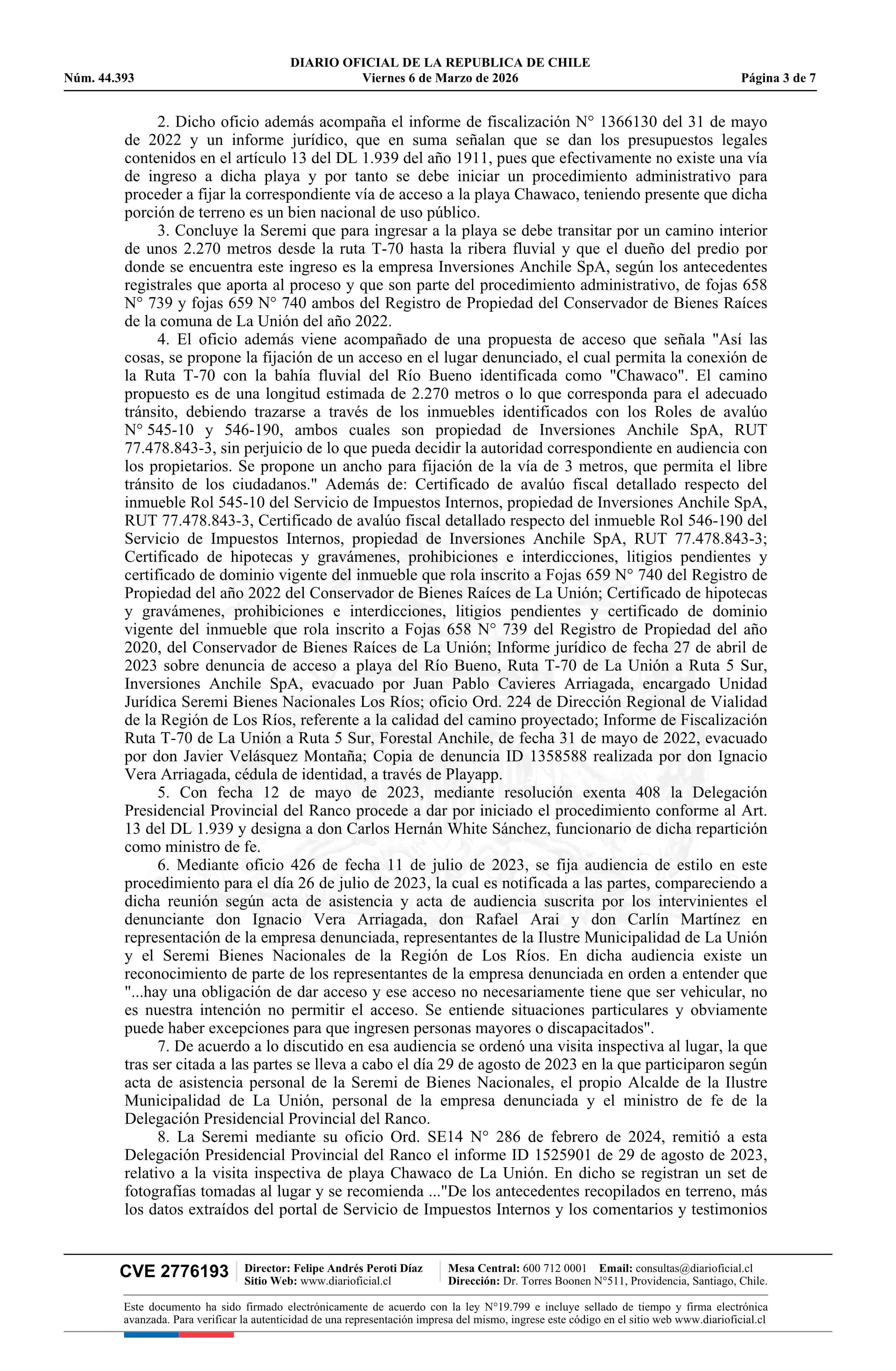Resolución exenta número 554, de 2025.- Resuelve fijación de acceso peatonal a playa ribera Lago Ranco, sector Chawaco, en la comuna de La Unión 06-03-2026 Diario Oficial Edición Electrónica |