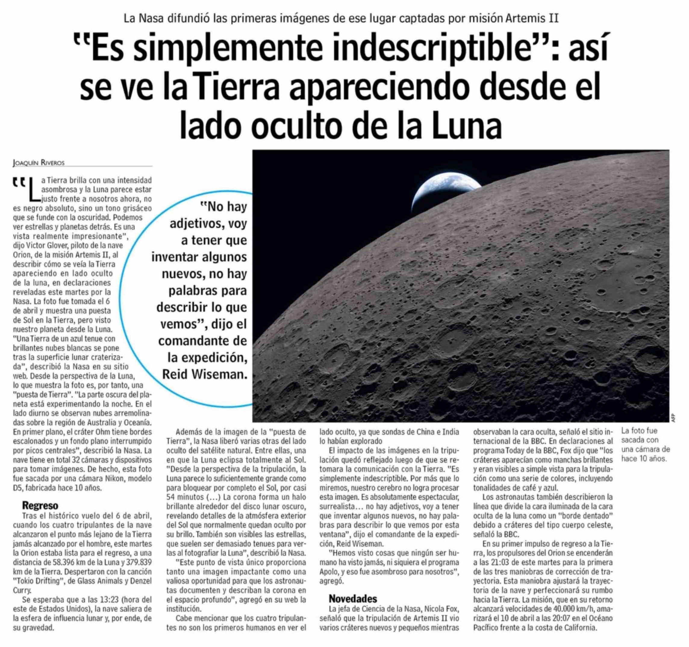 | Título: | "Es simplemente indescriptible": así se ve la Tierra apareciendo desde el lado oculto de la Luna |