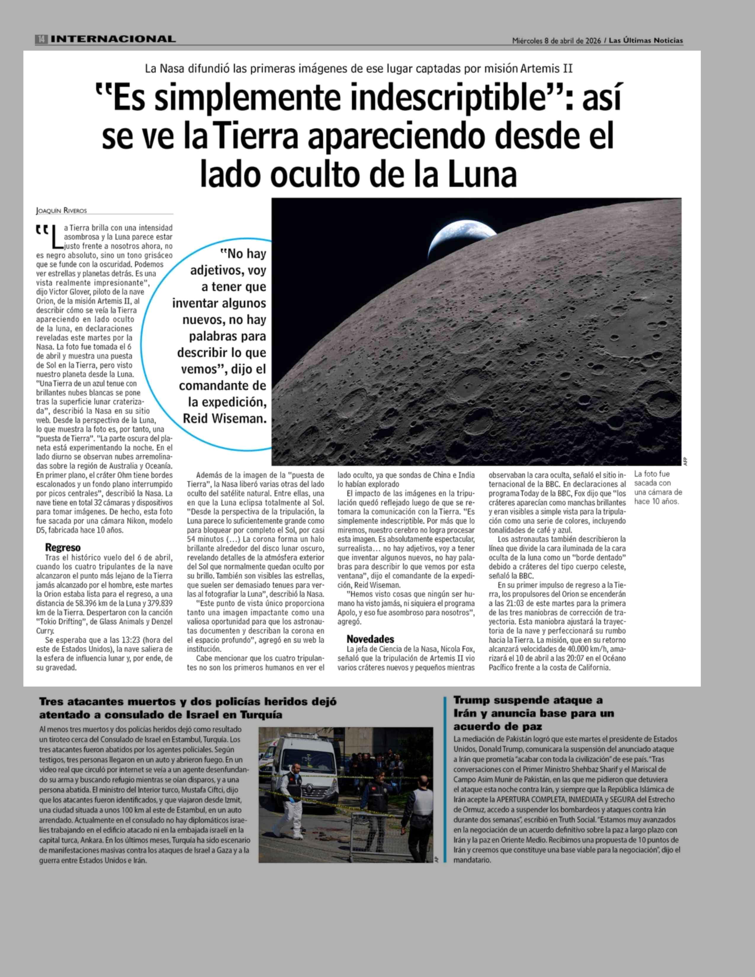 "Es simplemente indescriptible": así se ve la Tierra apareciendo desde el lado oculto de la Luna 08-04-2026 Las Últimas Noticias |