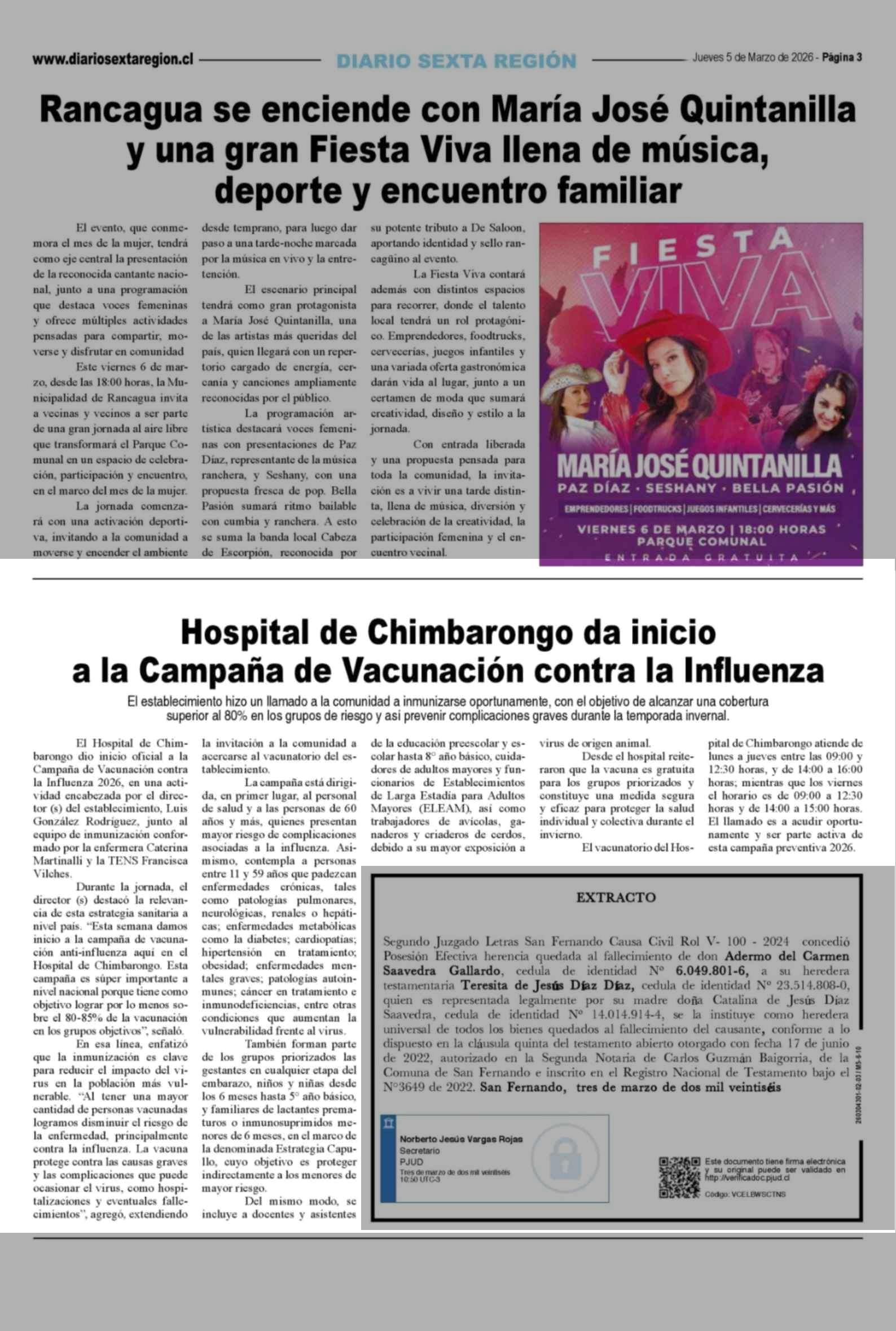 | Fecha: | 05-03-2026 | Sector: | Noticia general | Región: | Región del Libertador General Bernardo O'Higgins |