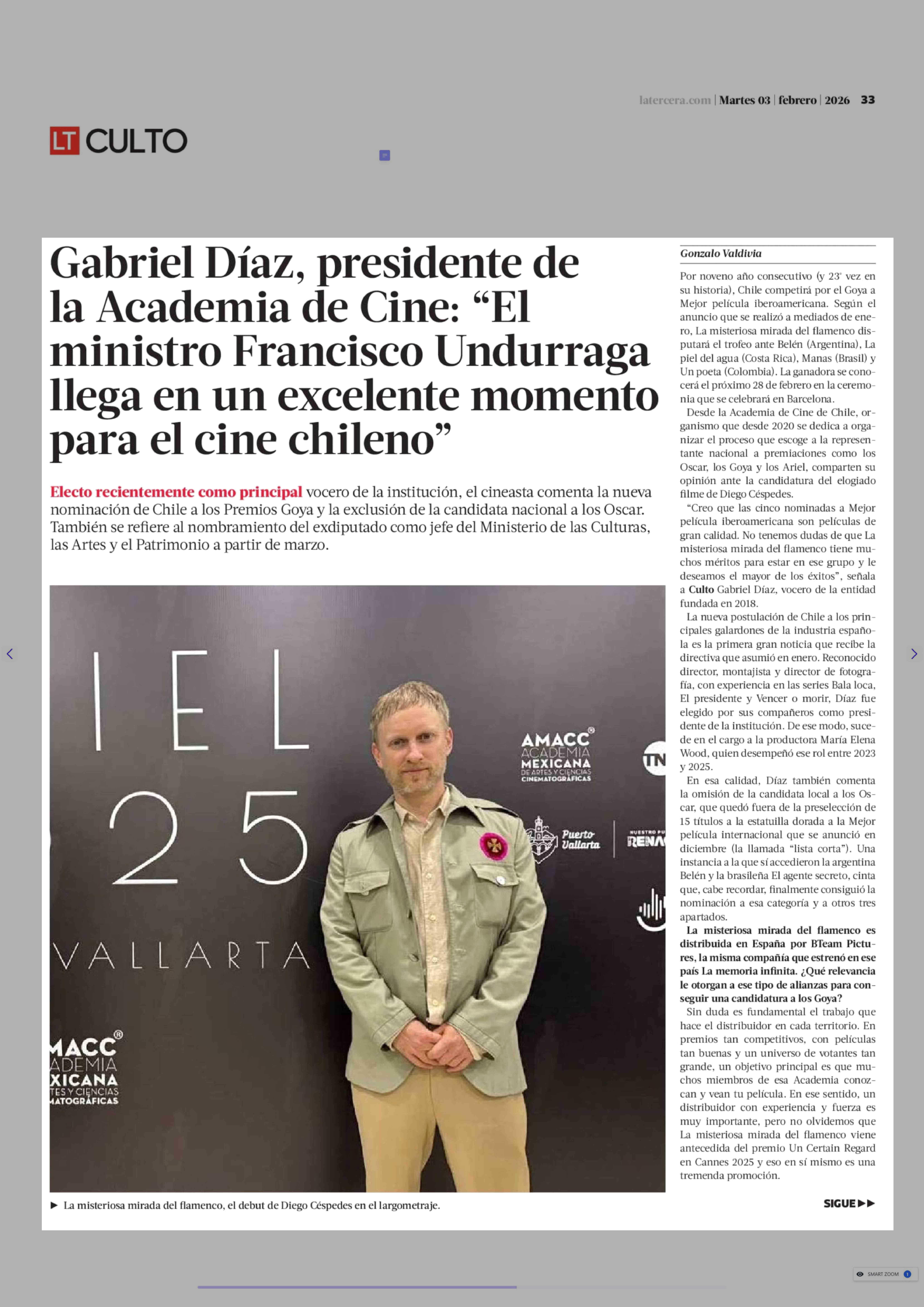 Gabriel Díaz, presidente de la Academia de Cine: "El ministro Francisco Undurraga llega en un excelente momento para el cine chileno" 03-02-2026 La Tercera |