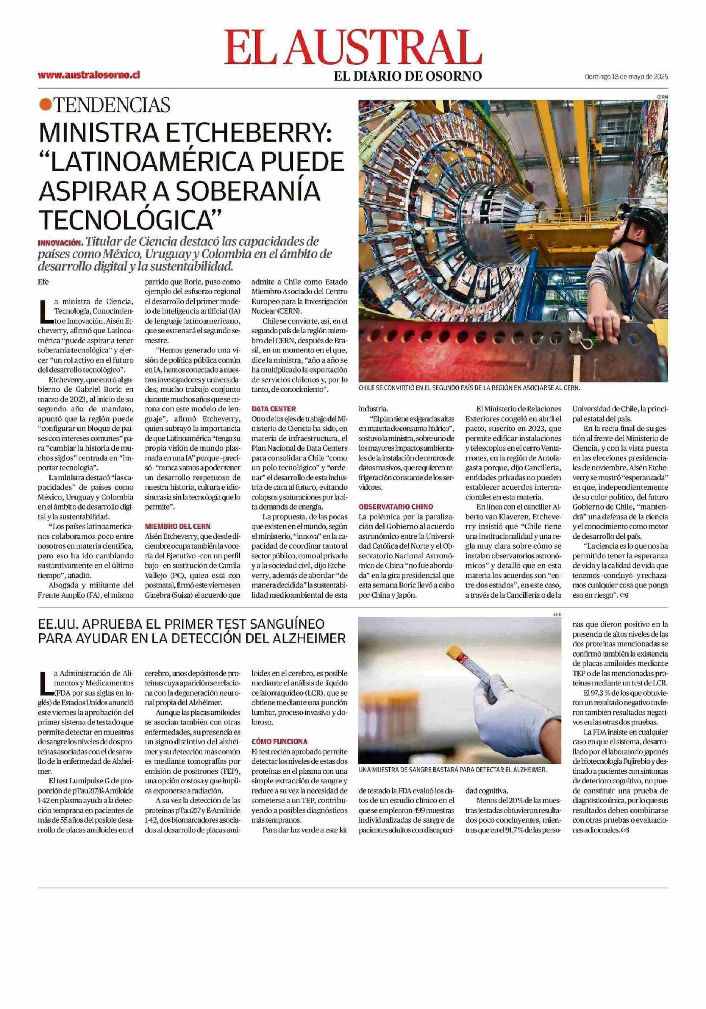 MINISTRA ETCHEBERRY: “LATINOAMERICA PUEDE ASPIRAR A SOBERANIA TECNOLÓGICA” 18-05-2025 El Austral de Osorno |