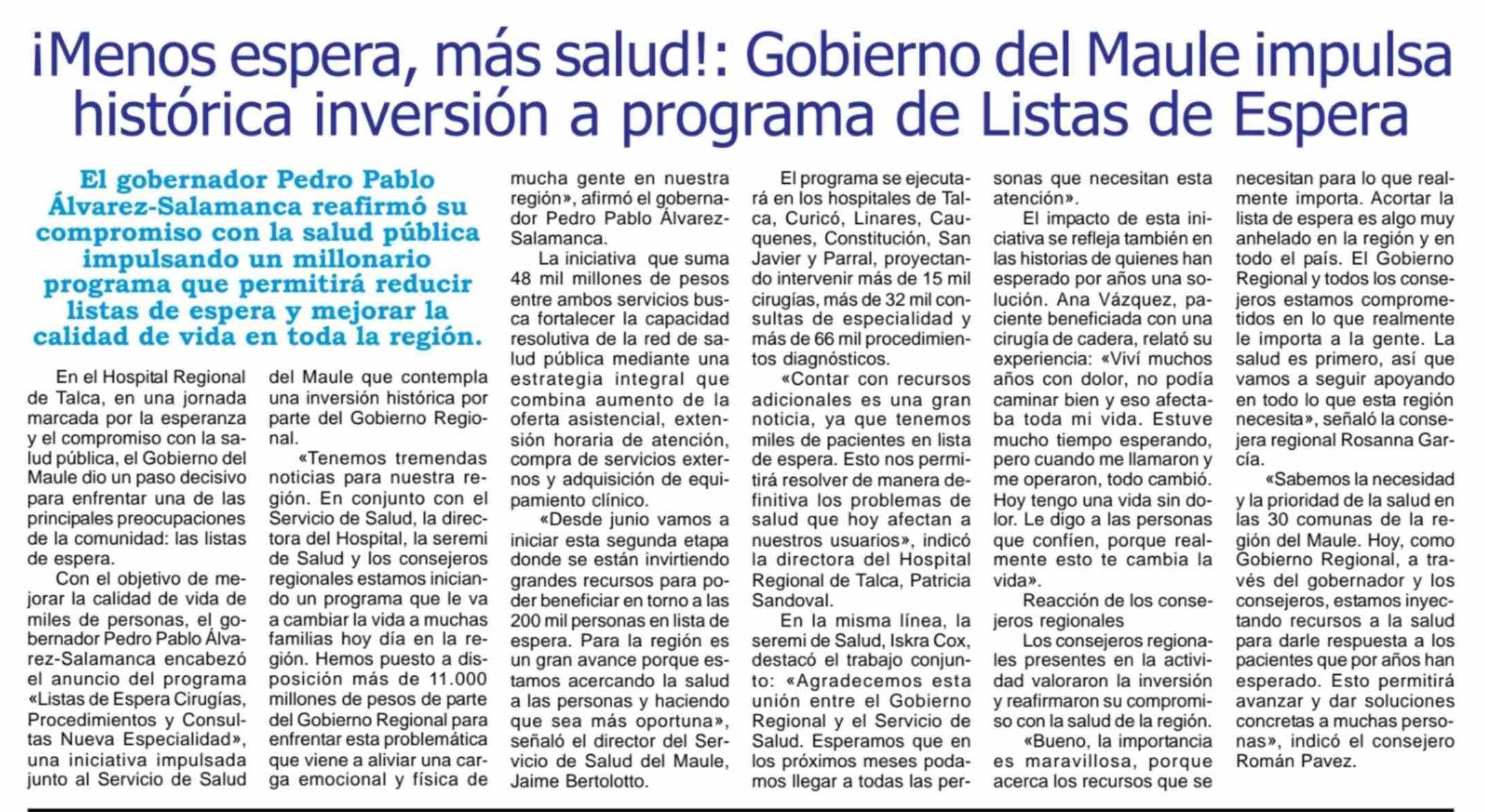 | Título: | IMenos espera, más salud !: Gobierno del Maule impulsa histórica inversión a programa de Listas de Espera |