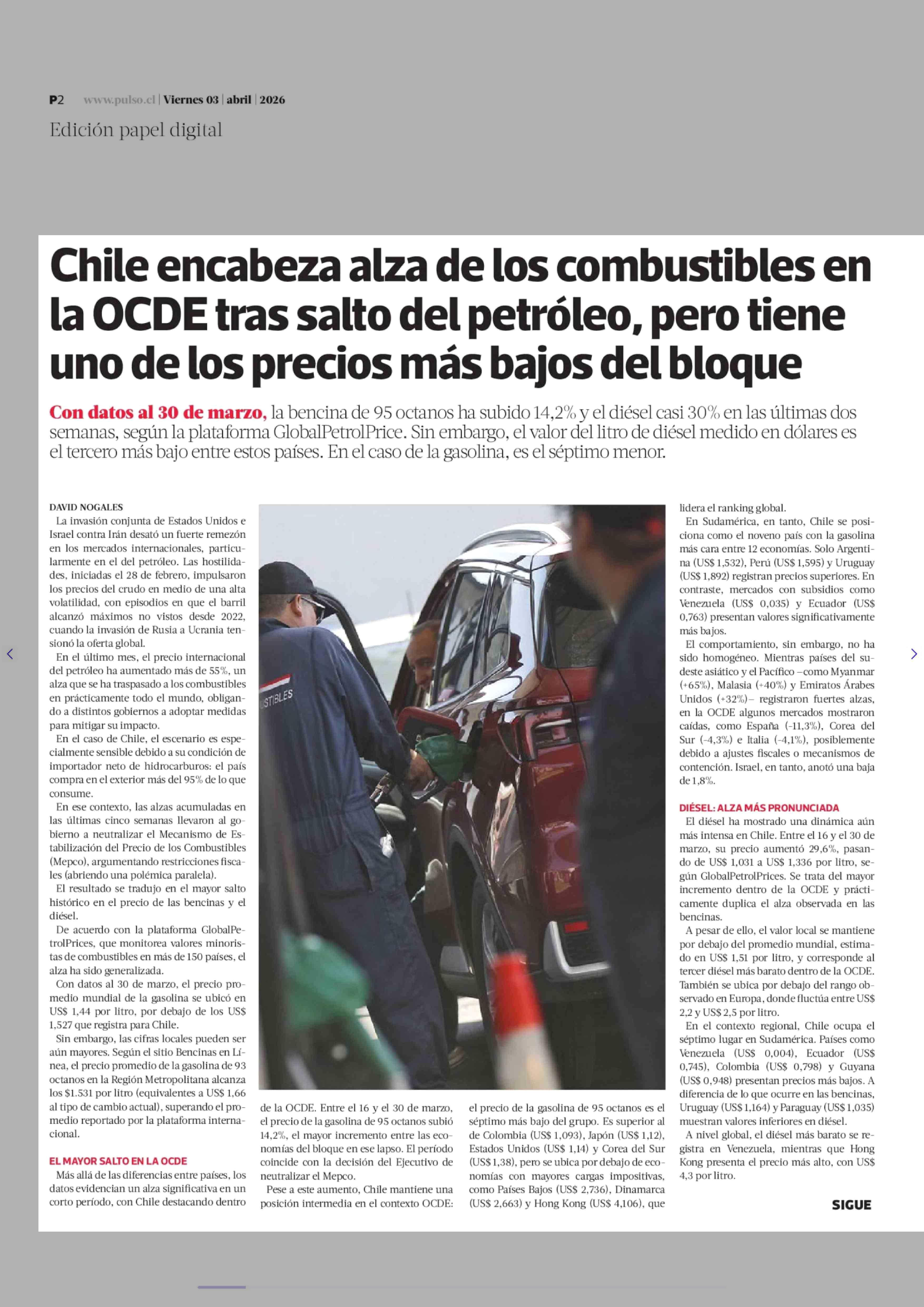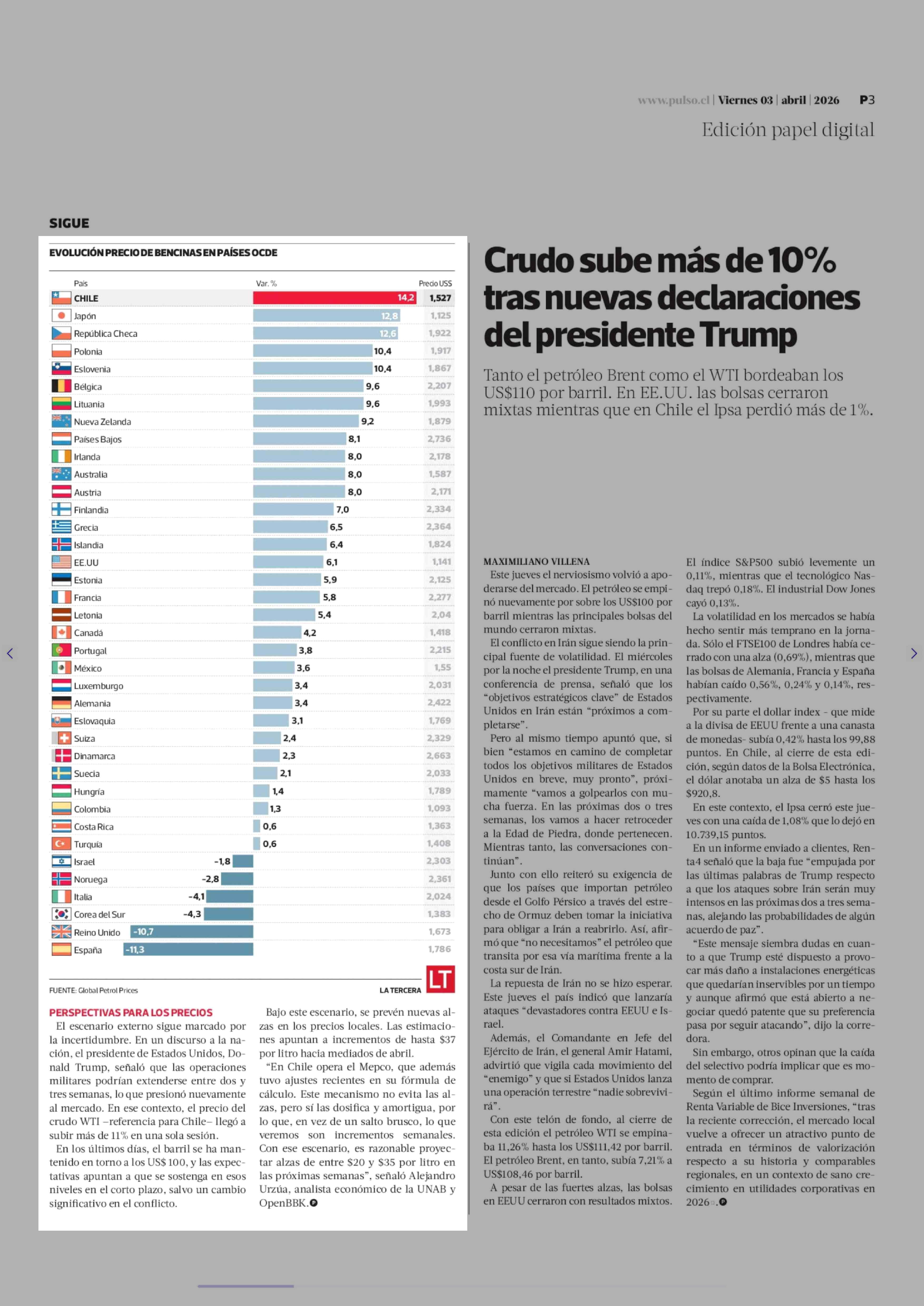 Título: Chile encabeza alza de los combustibles en la OCDE tras salto del petróleo, pero tiene uno de los precios más bajos del bloque