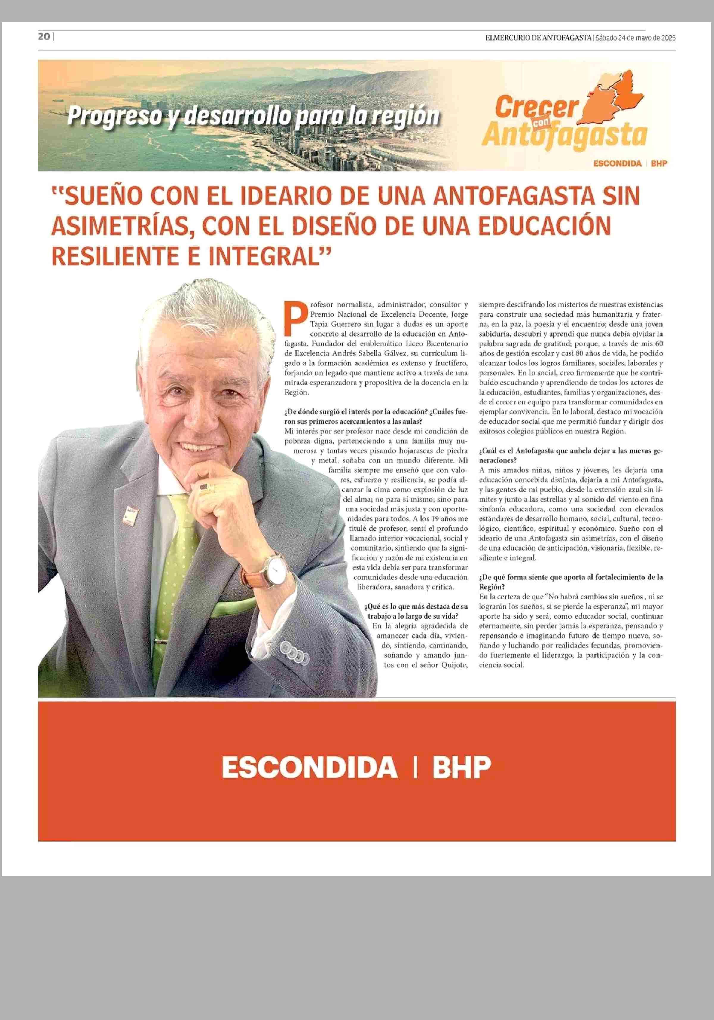 "SUEÑO CON EL IDEARIO DE UNA ANTOFAGASTA SIN ASIMETRÍAS, CON EL DISEÑO DE UNA EDUCACIÓN RESILIENTE E INTEGRAL” 24-05-2025 El Mercurio de Antofagasta |
