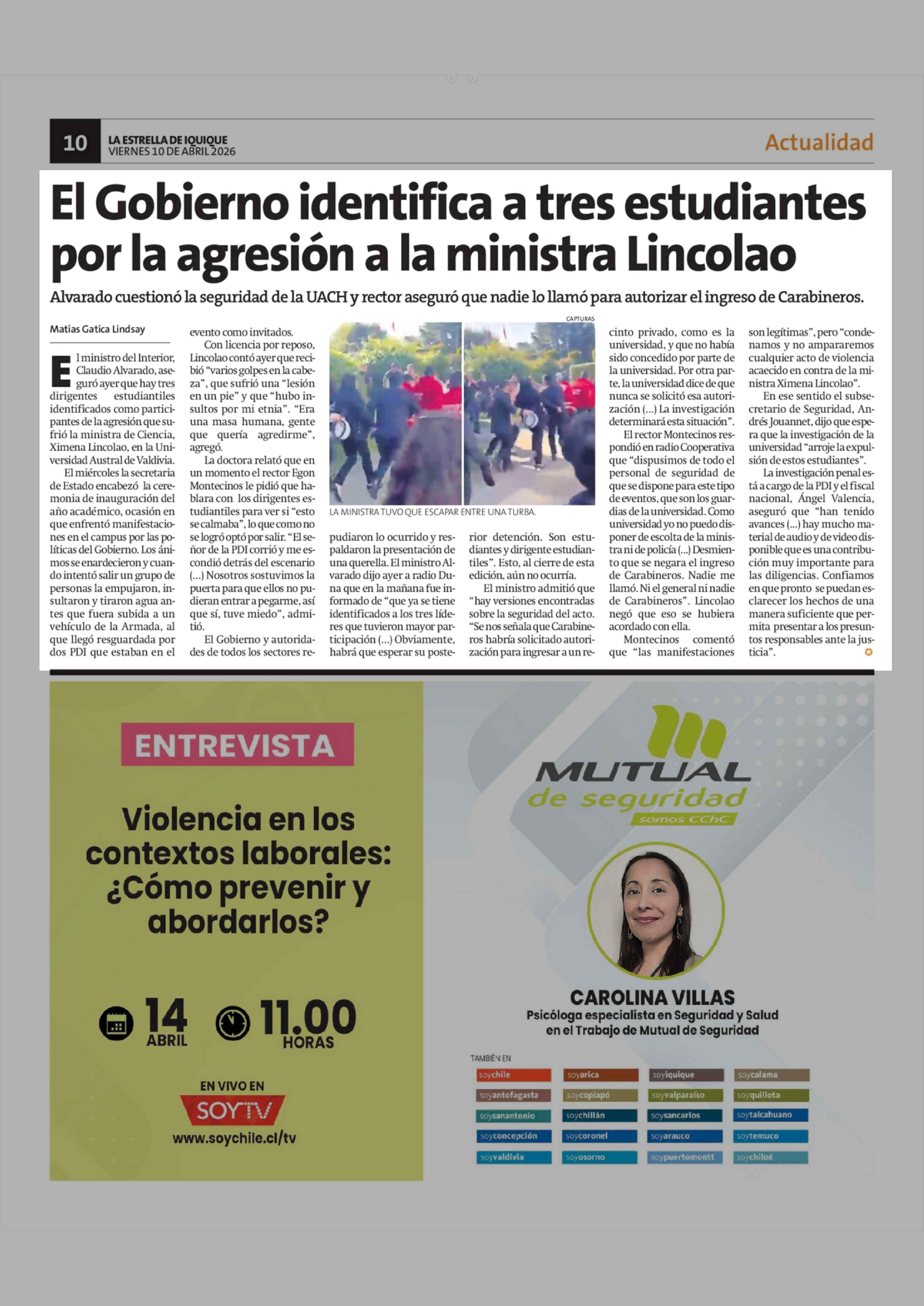 El Gobierno identifica a tres estudiantes por la agresión a la ministra Lincolao 10-04-2026 La Estrella de Iquique |