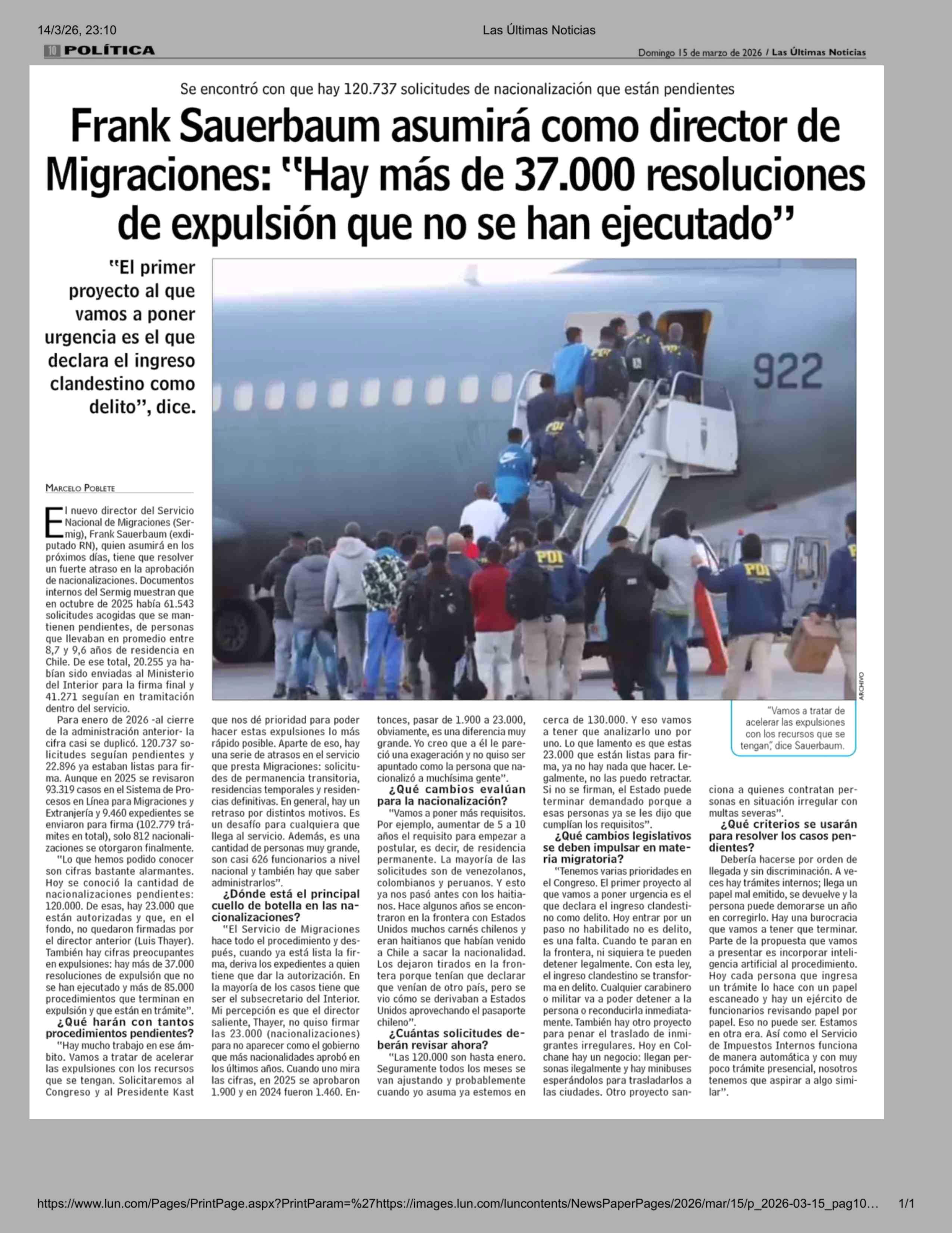 Título: Frank Sauerbaum asumirá como director de Migraciones: "Hay más de 37.000 resoluciones de expulsión que no se han ejecutado"