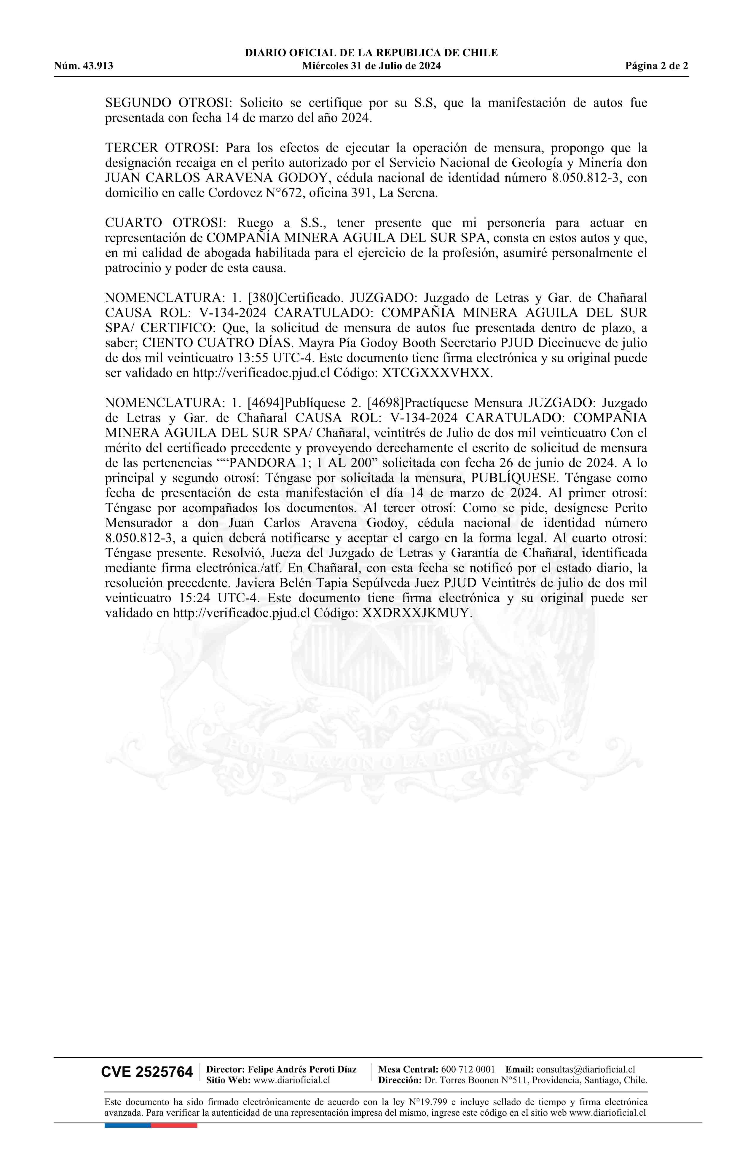 PANDORA 1; 1 AL 200 / Compañía Minera Águila del Sur SpA 31-07-2024 DIARIO OFICIAL CHILE - BOLETÍN OFICIAL DE MINERÍA |