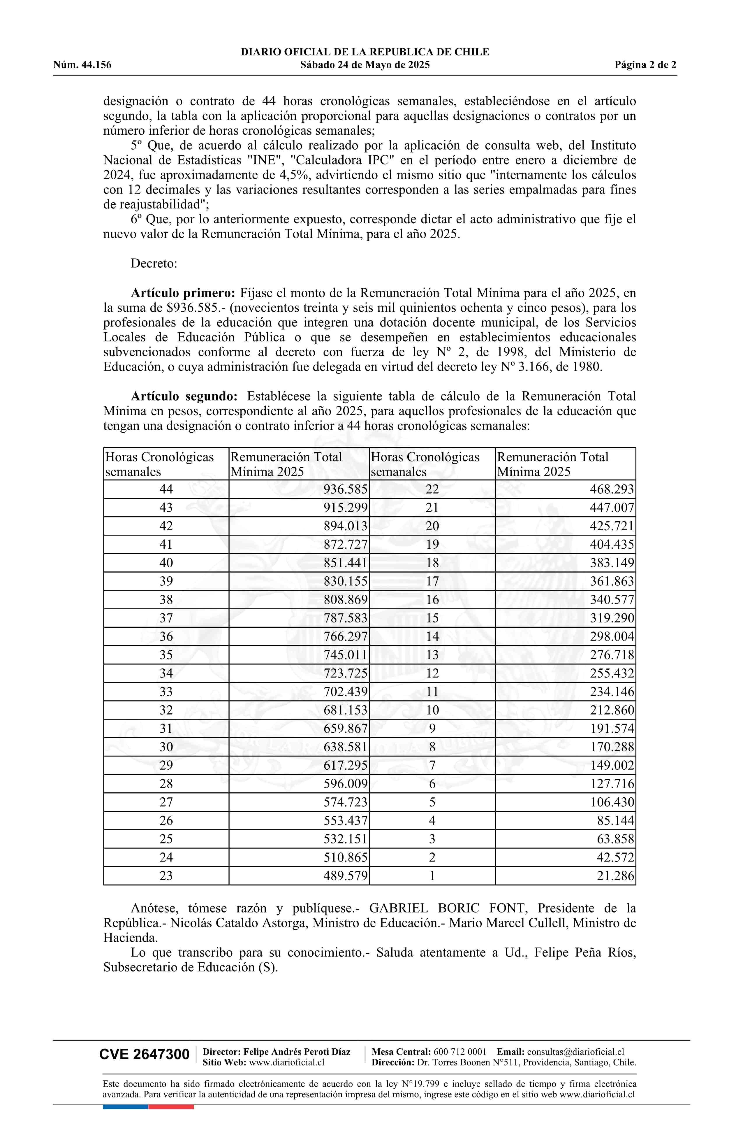 | Título: | Decreto número 16, de 2025.- Fija la remuneración total mínima para los profesionales de la educación que se desempeñen en establecimientos educacionales subvencionados y de administración delegada para el año 2025 |