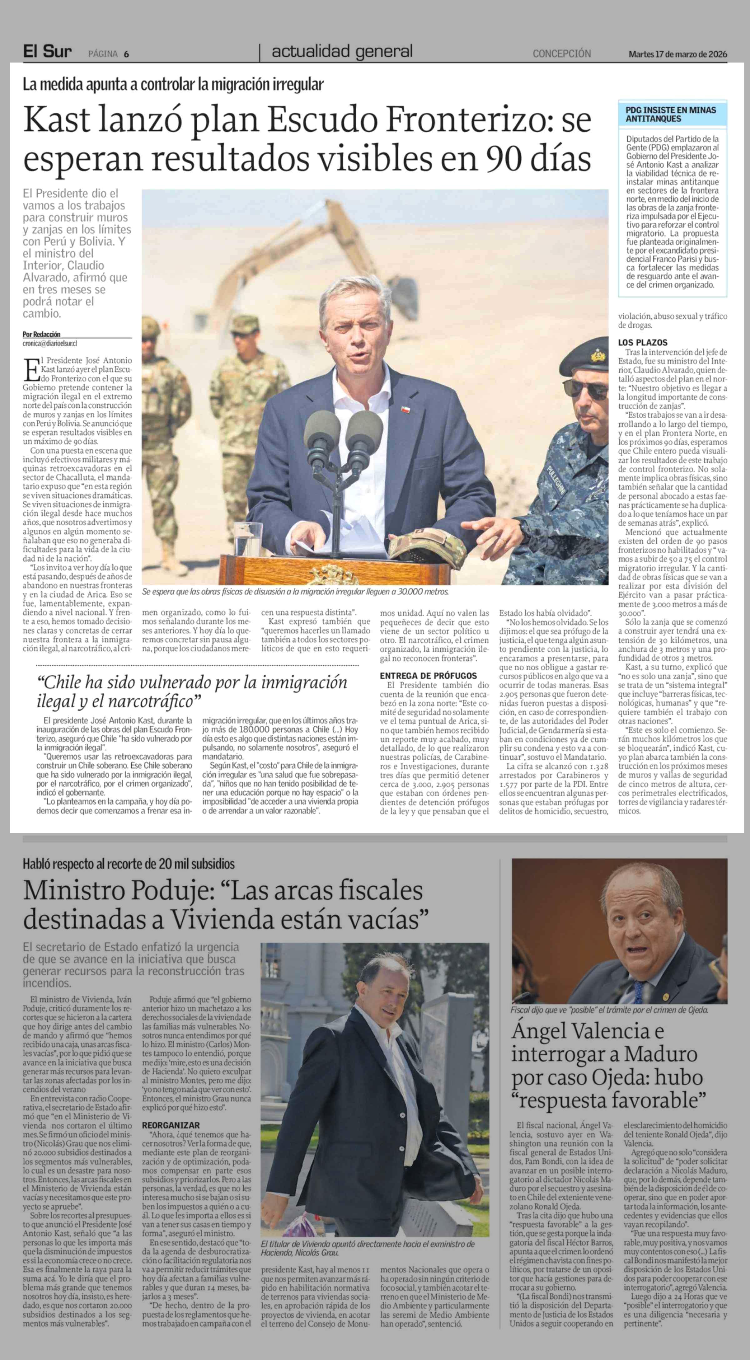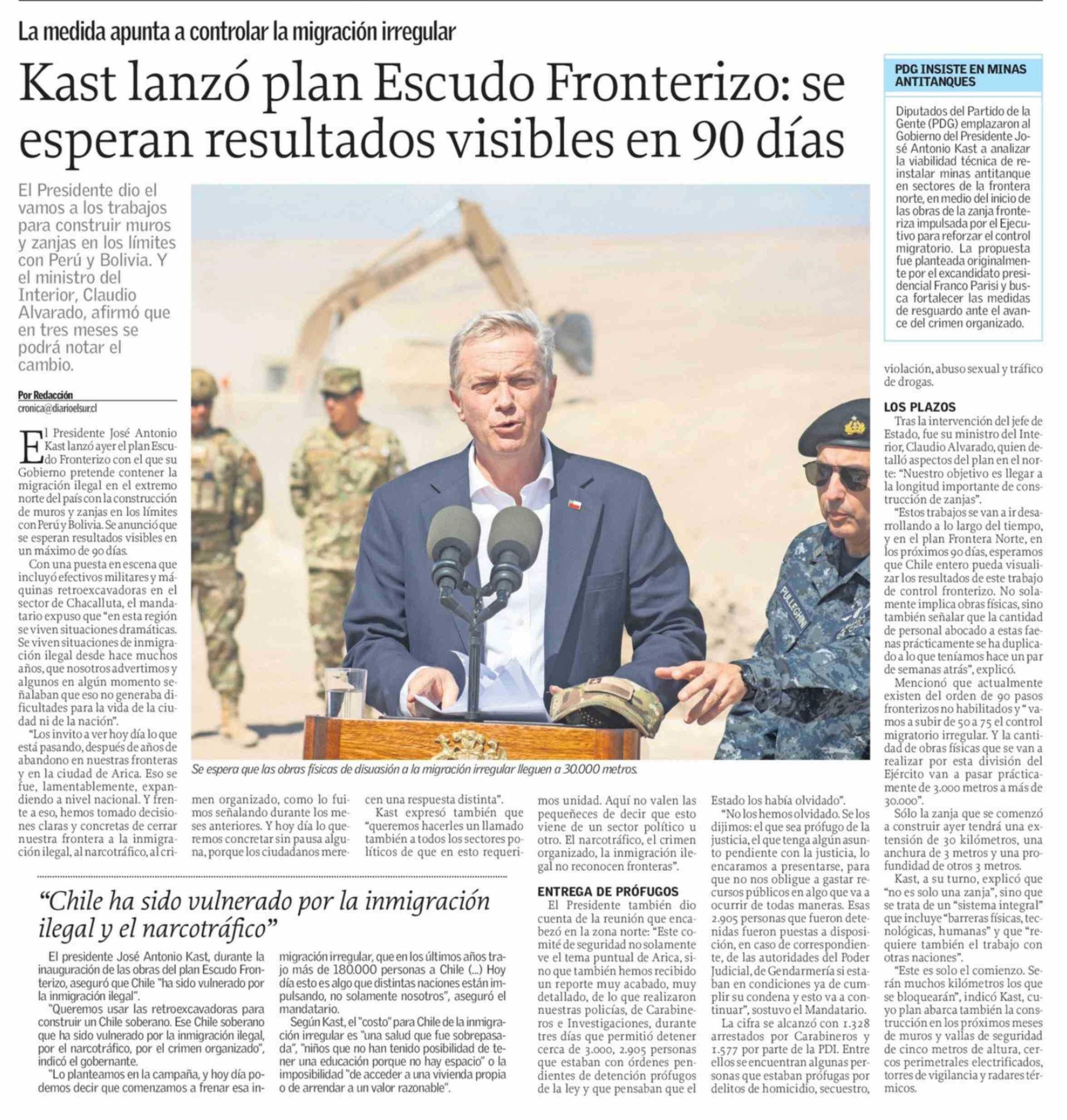 Kast lanzó plan Escudo Fronterizo: se esperan resultados visibles en 90 días 17-03-2026 El Sur |