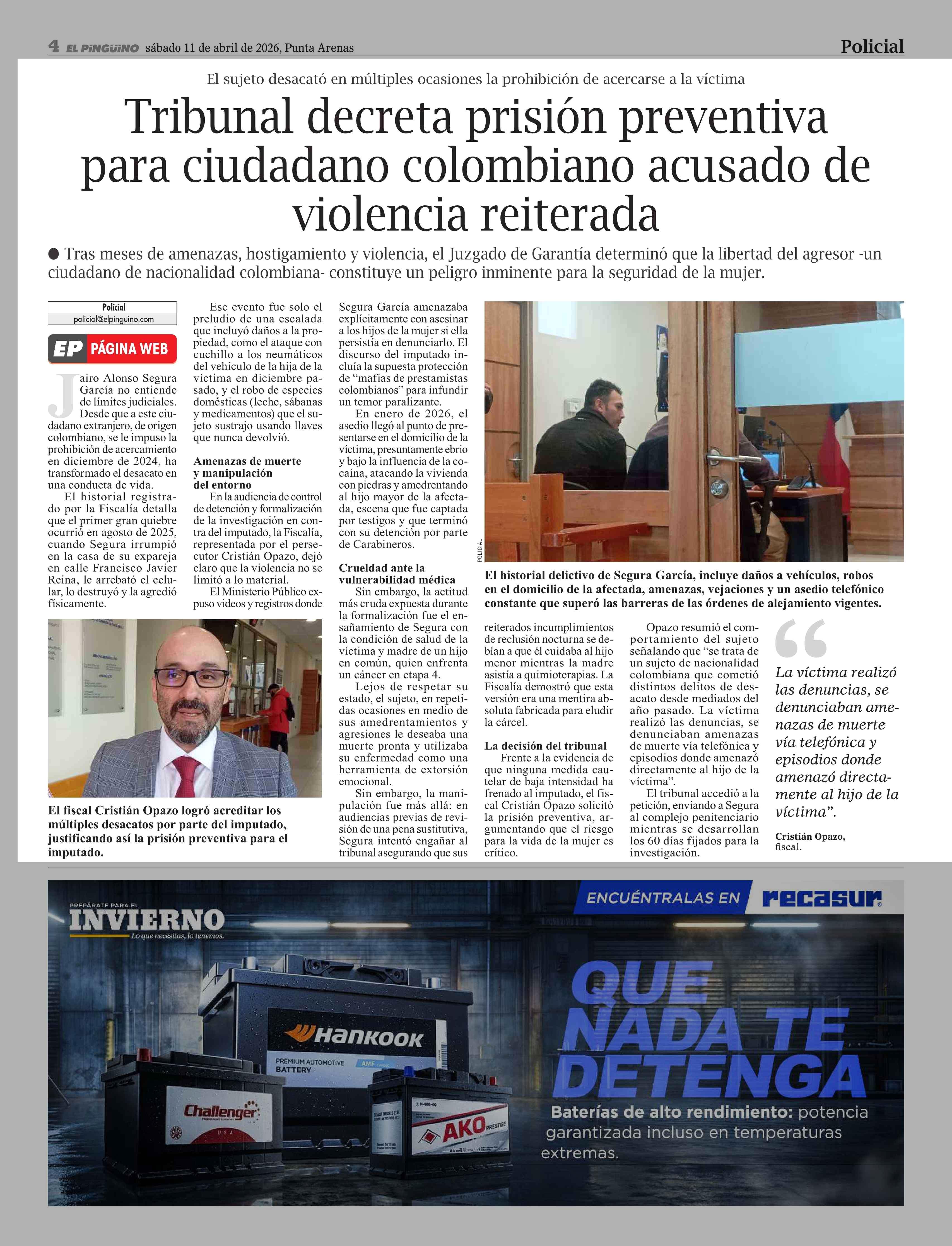Tribunal decreta prisión preventiva para ciudadano colombiano acusado de violencia reiterada 11-04-2026 El Pingüino |