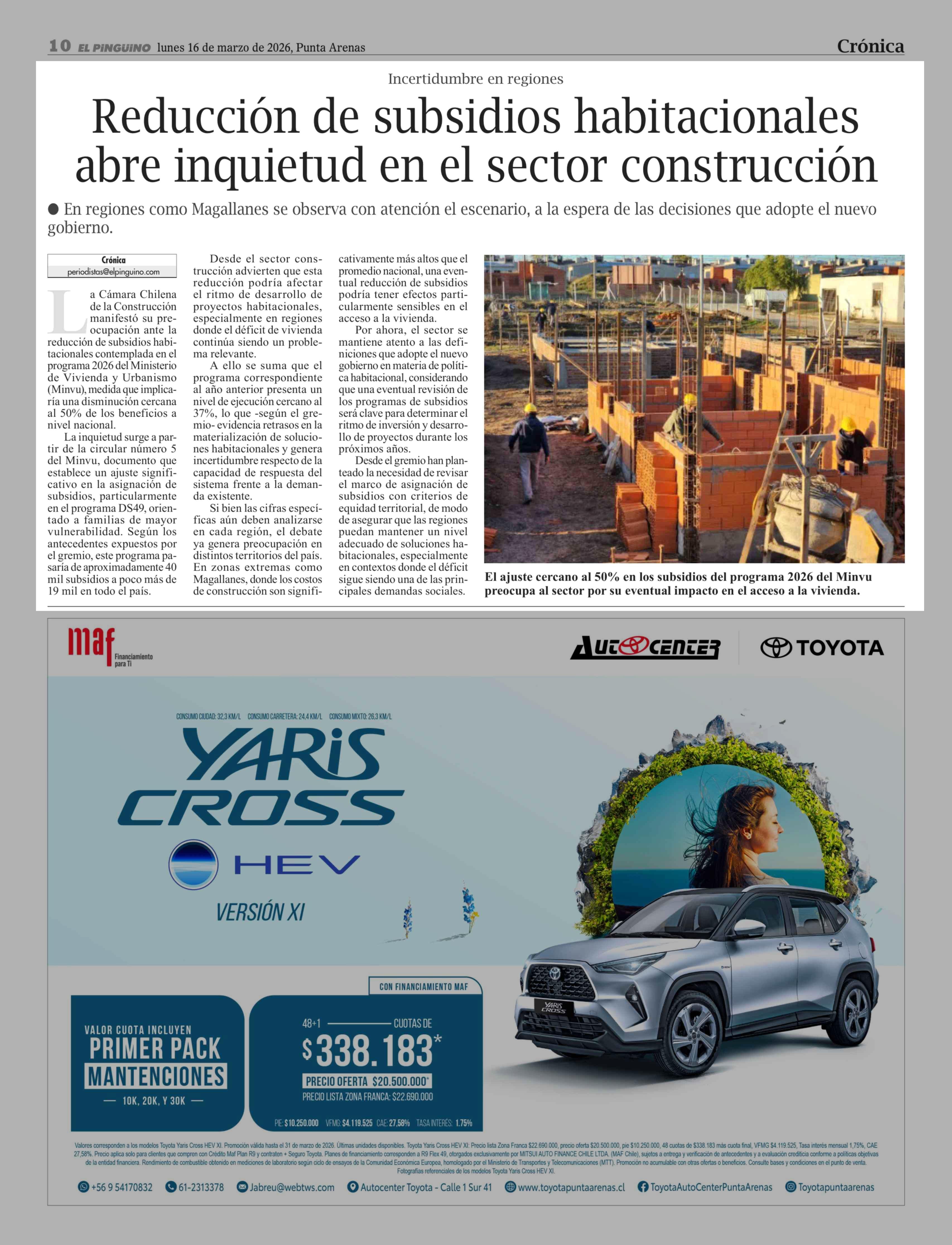 Reducción de subsidios habitacionales abre inquietud en el sector construcción 16-03-2026 El Pingüino |