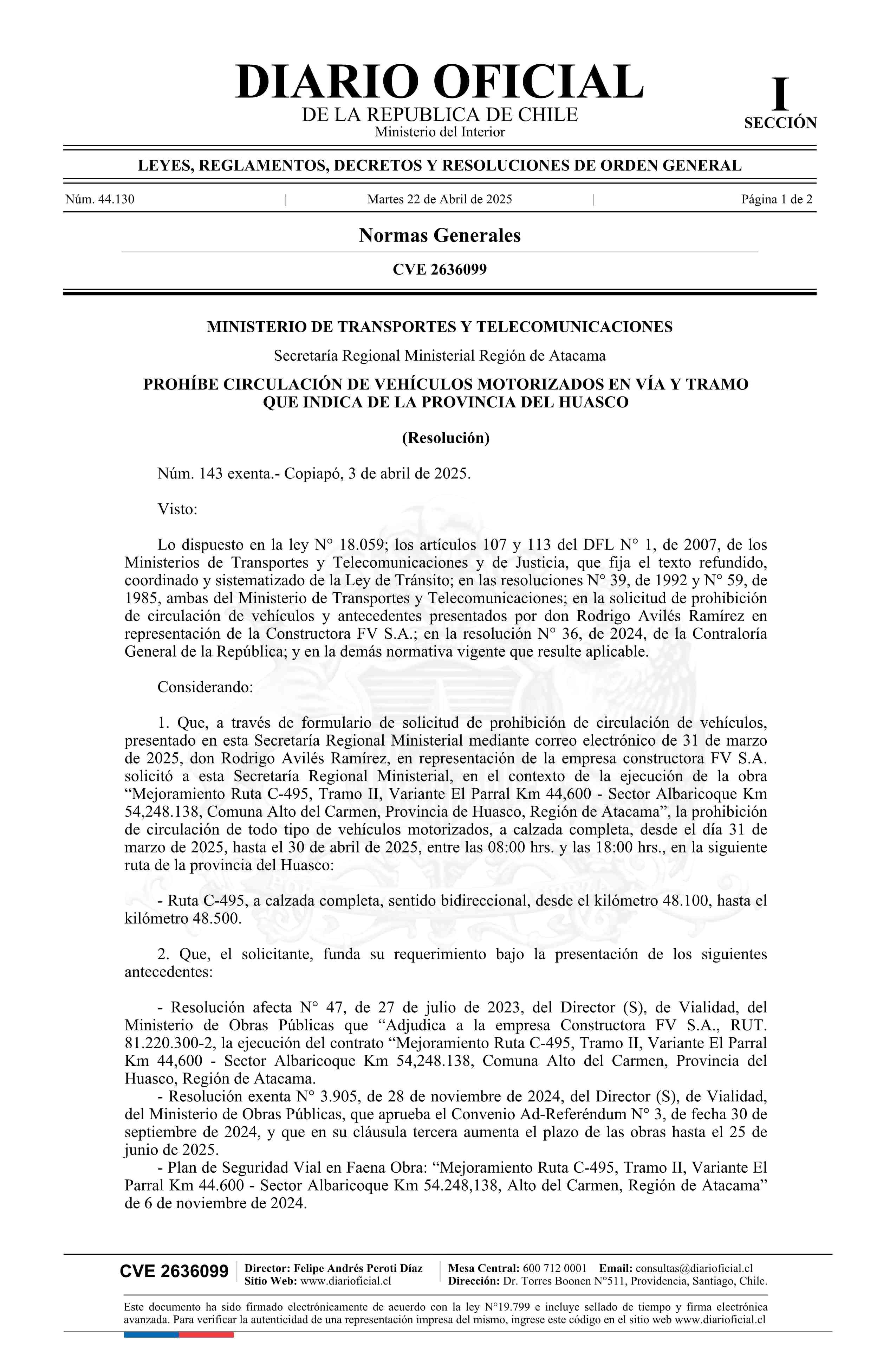 Resolución exenta número 143, de 2025.- Prohíbe circulación de vehículos motorizados en vía y tramo que indica de la provincia del Huasco 22-04-2025 Diario Oficial Edición Electrónica |