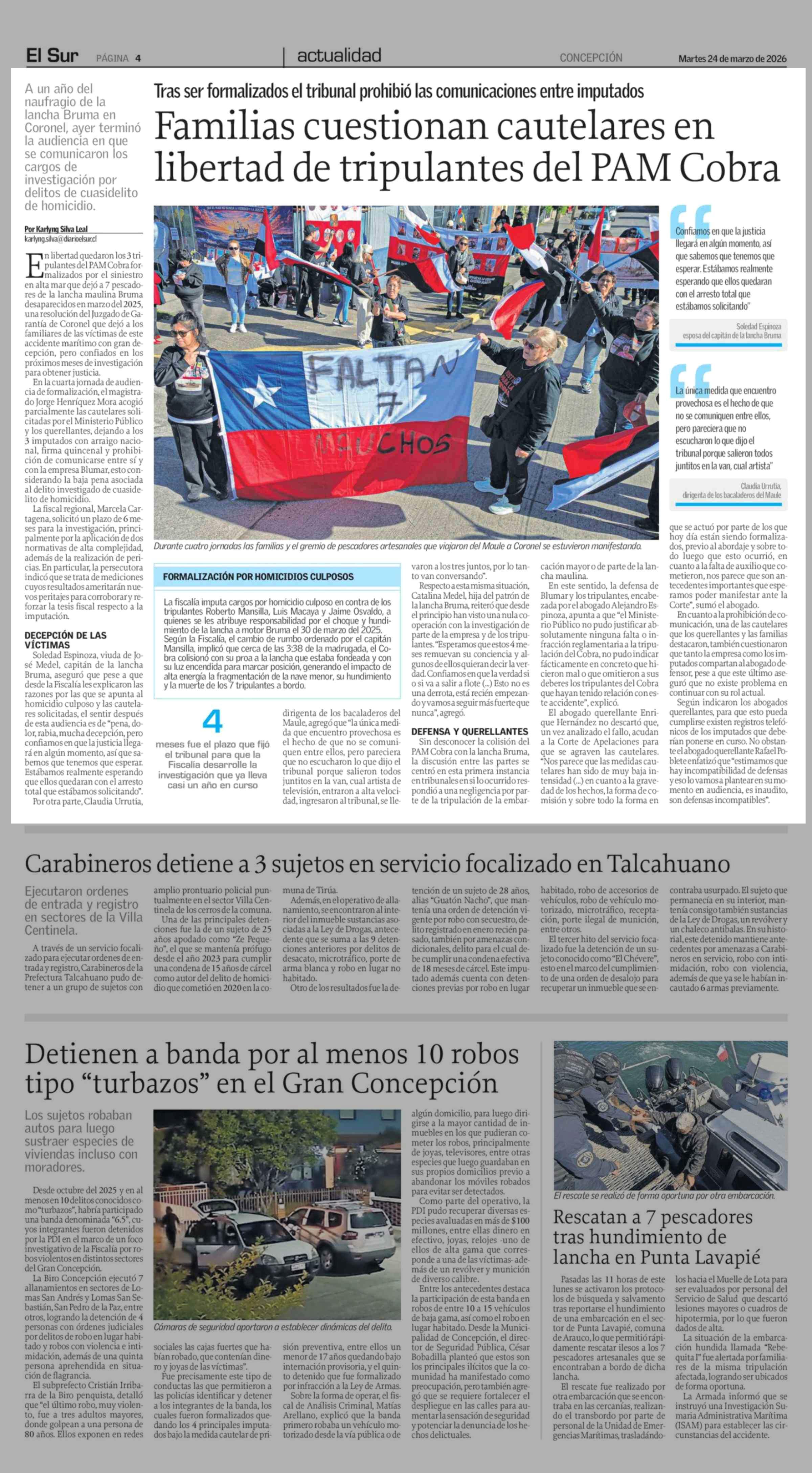 Familias cuestionan cautelares en libertad de tripulantes del PAM Cobra 24-03-2026 El Sur |
