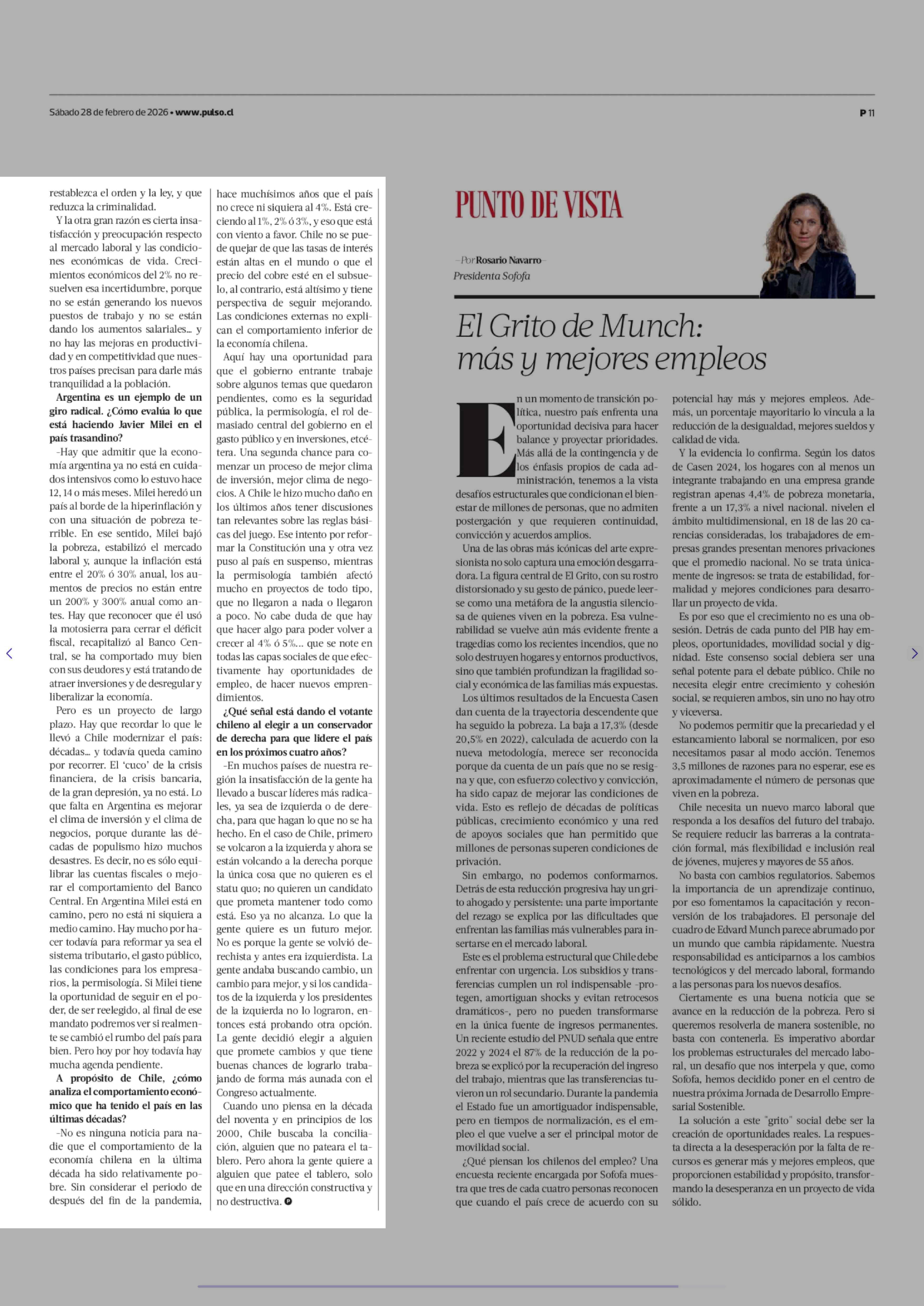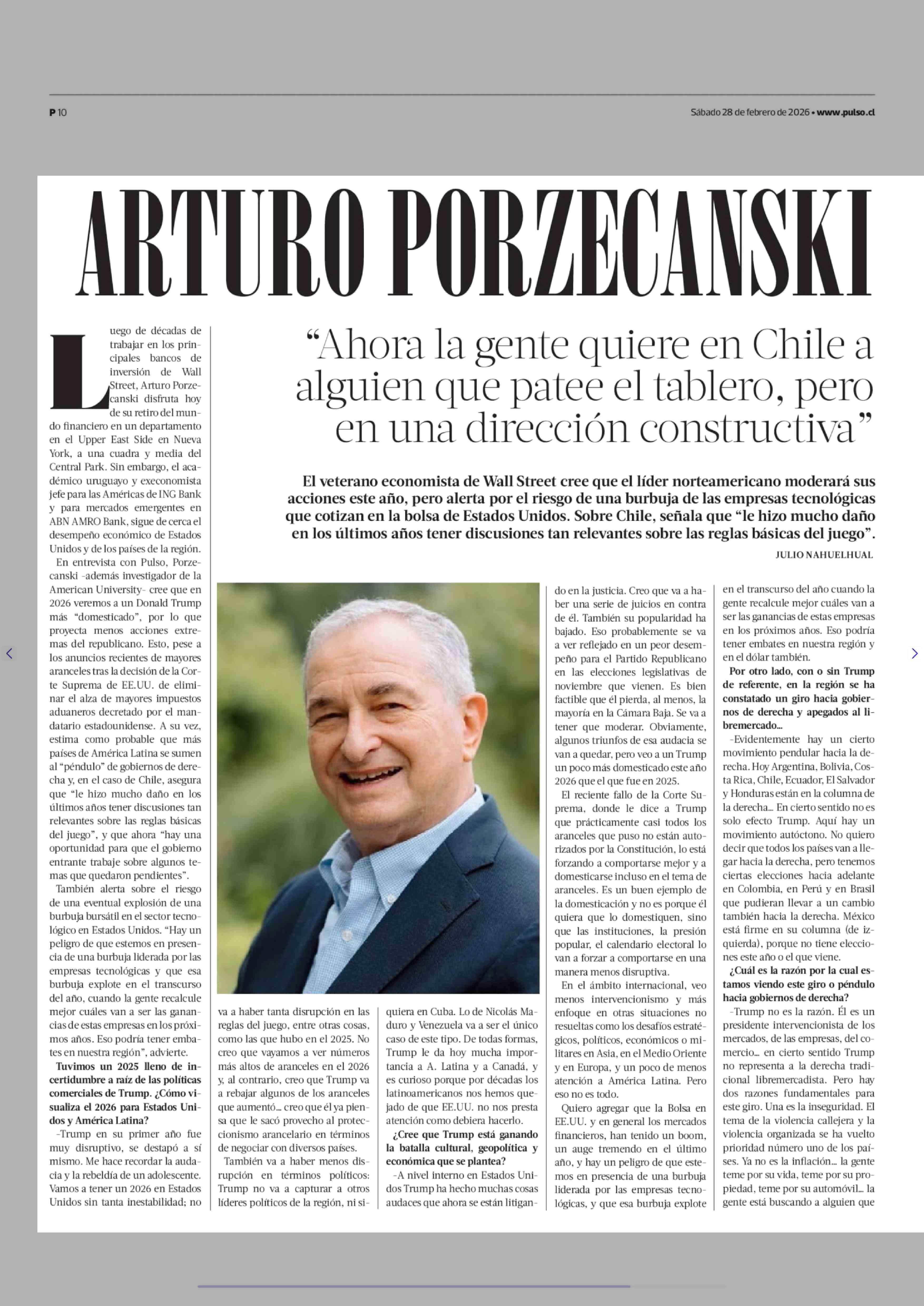 ARTURO PORZECANSKI "Ahora la gente quiere en Chile a alguien que patee el tablero, pero en una dirección constructiva" 28-02-2026 La Tercera |