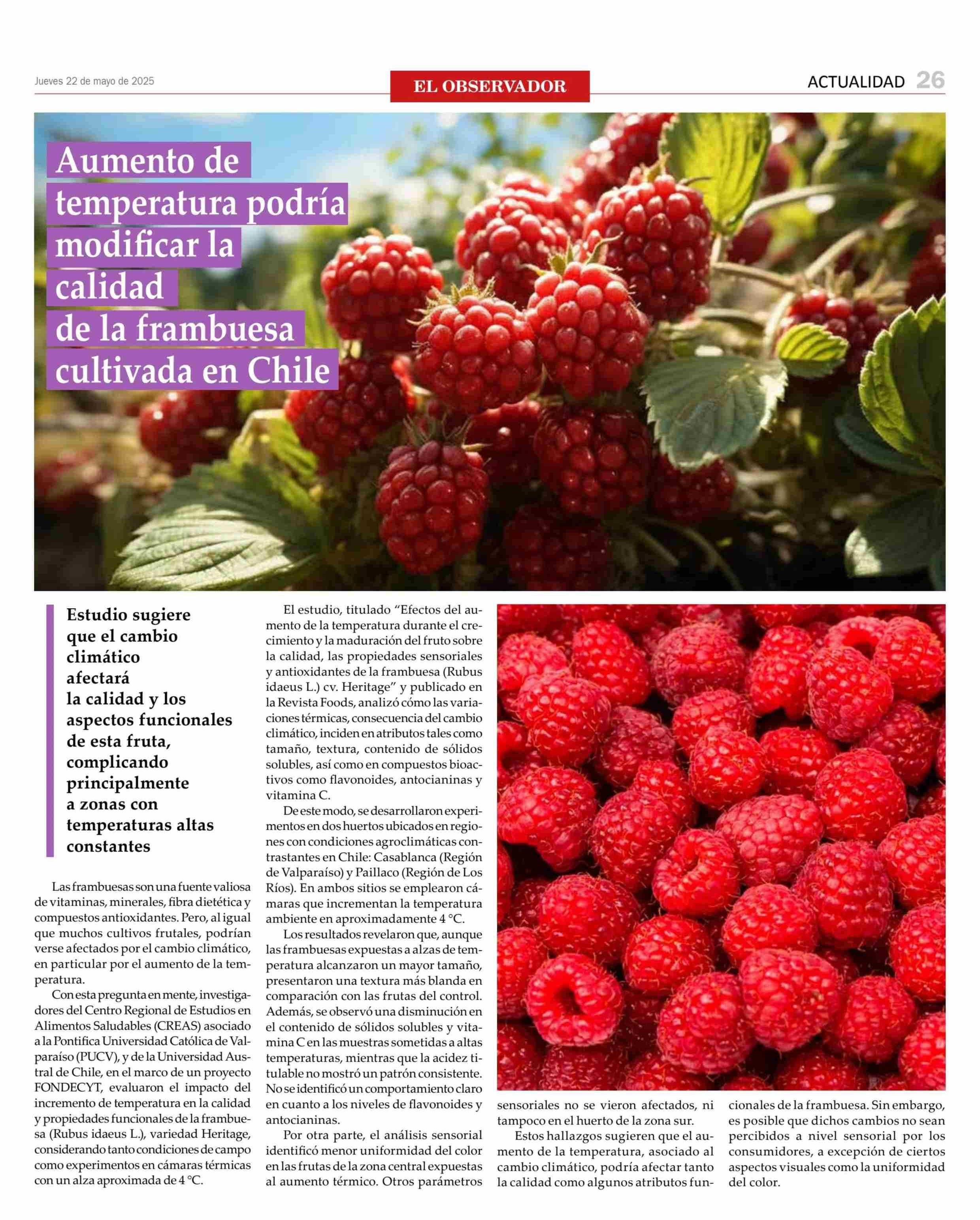 Aumento de temperatura podría modificar la calidad de la frambuesa cultivada en Chile 22-05-2025 El Observador Vespertino |
