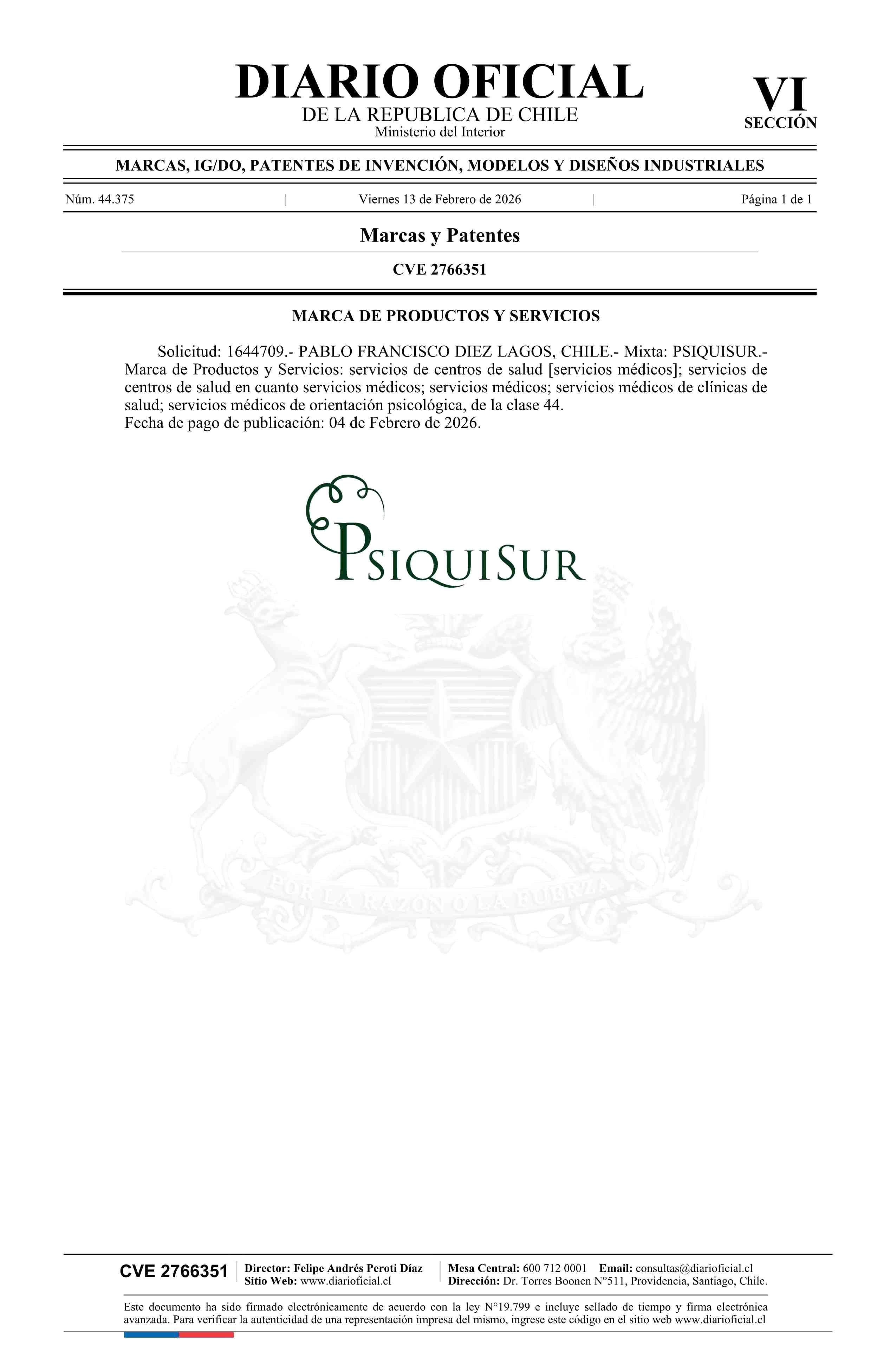Solicitud número 1644709.- PSIQUISUR 13-02-2026 Diario Oficial Edición Electrónica |