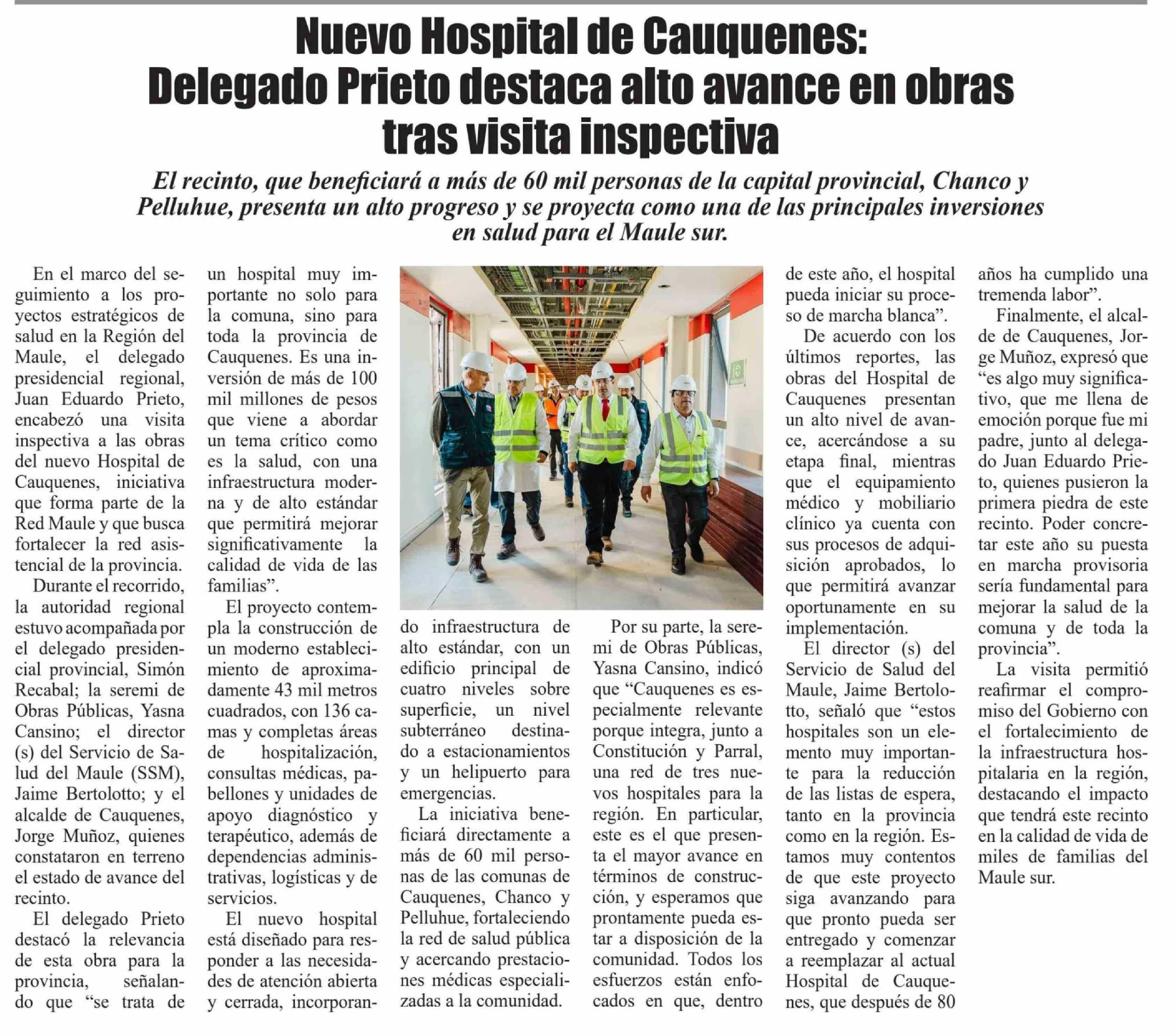 Título: Nuevo Hospital de Cauquenes: Delegado Prieto destaca alto avance en obras tras visita inspectiva