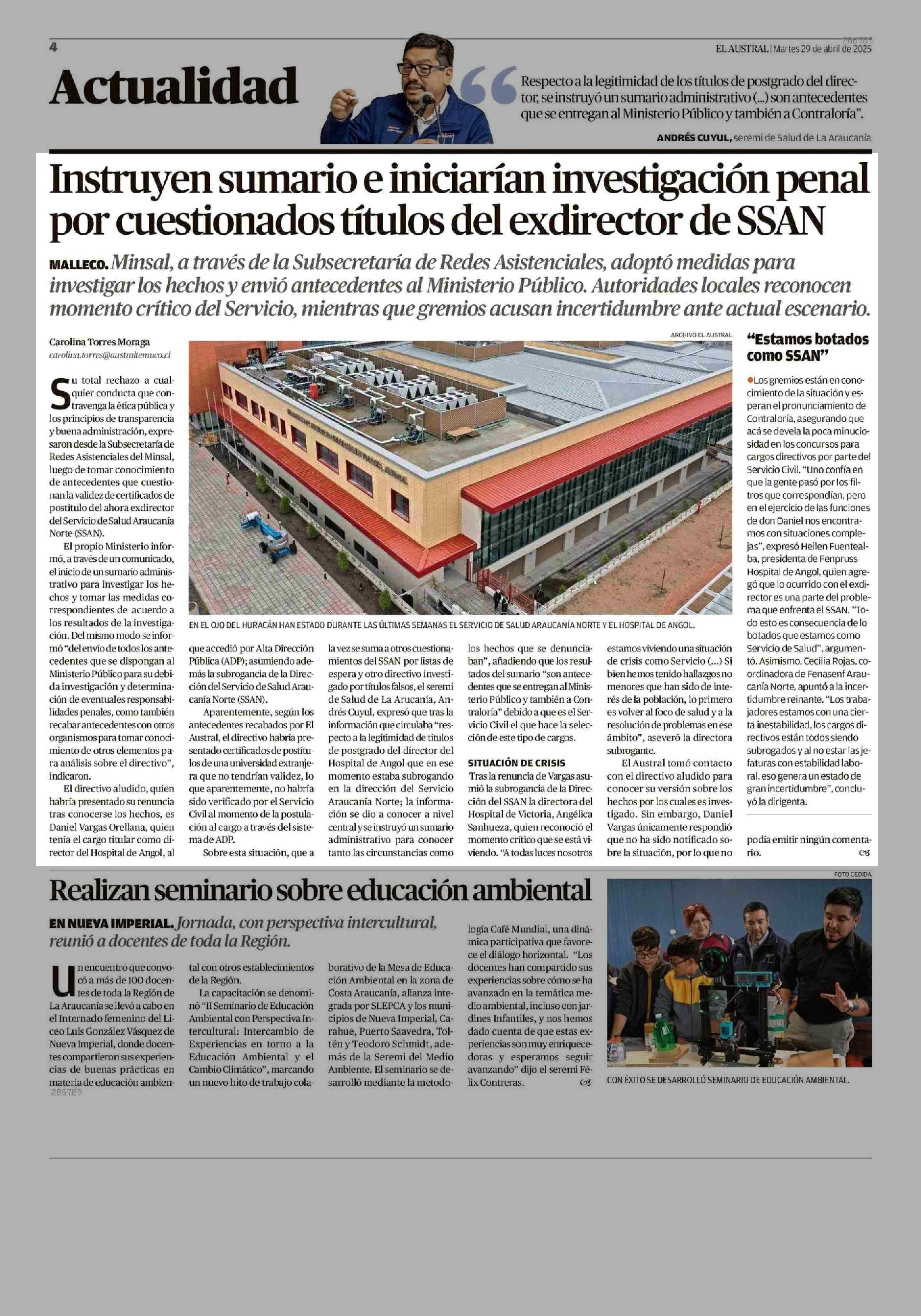 Instruyen sumario e iniciarían investigación penal por cuestionados títulos del exdirector de SSAN 29-04-2025 El Austral de la Araucanía |