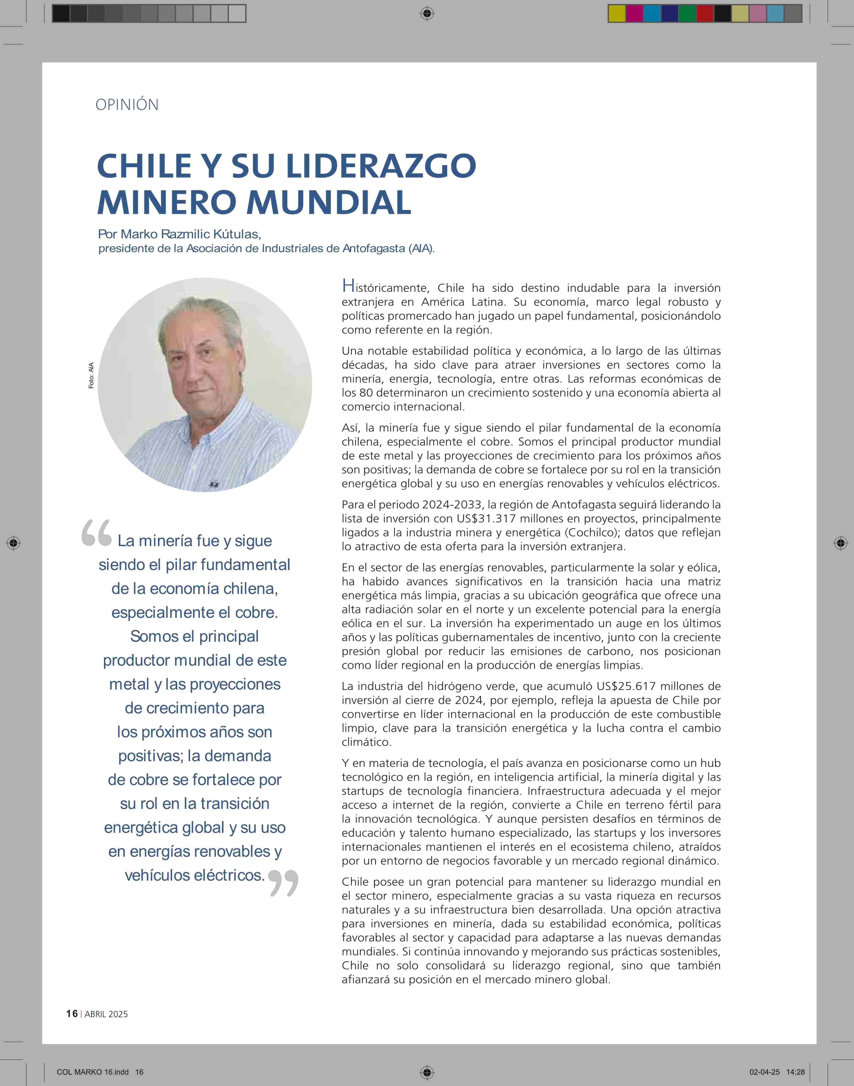 COLUMNAS DE OPINIÓN: CHILE Y SU LIDERAZGO MINERO MUNDIAL 14-04-2025 Revista Nueva Minería & Energía |