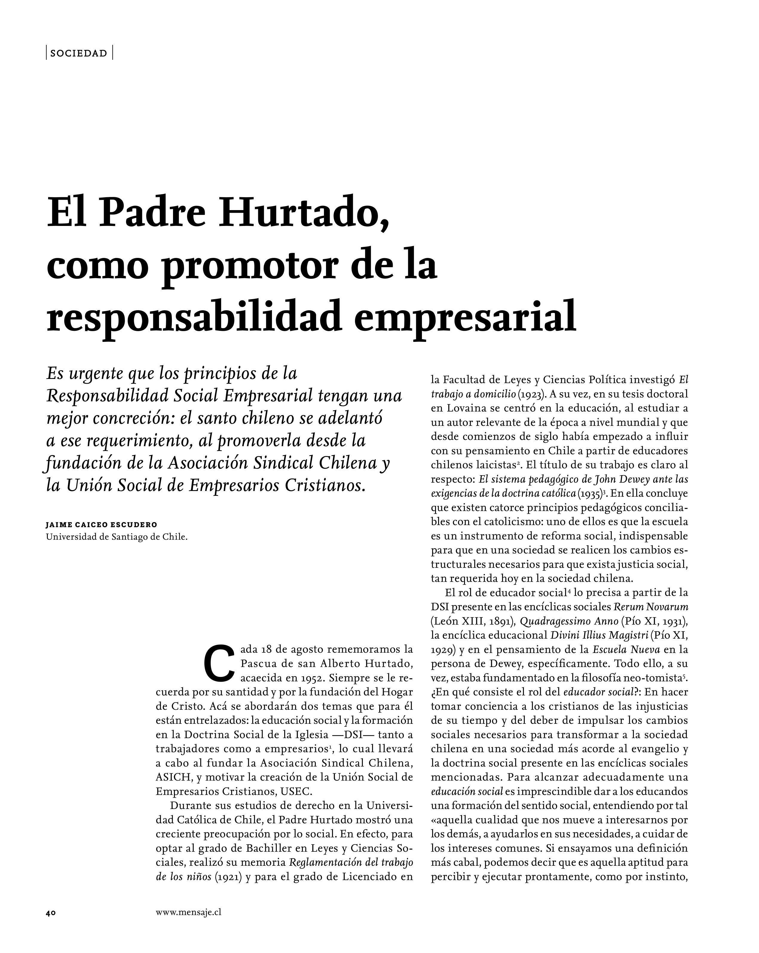 El Padre Hurtado, como promotor de la responsabilidad empresarial 03-08-2021 Revista Mensaje |
