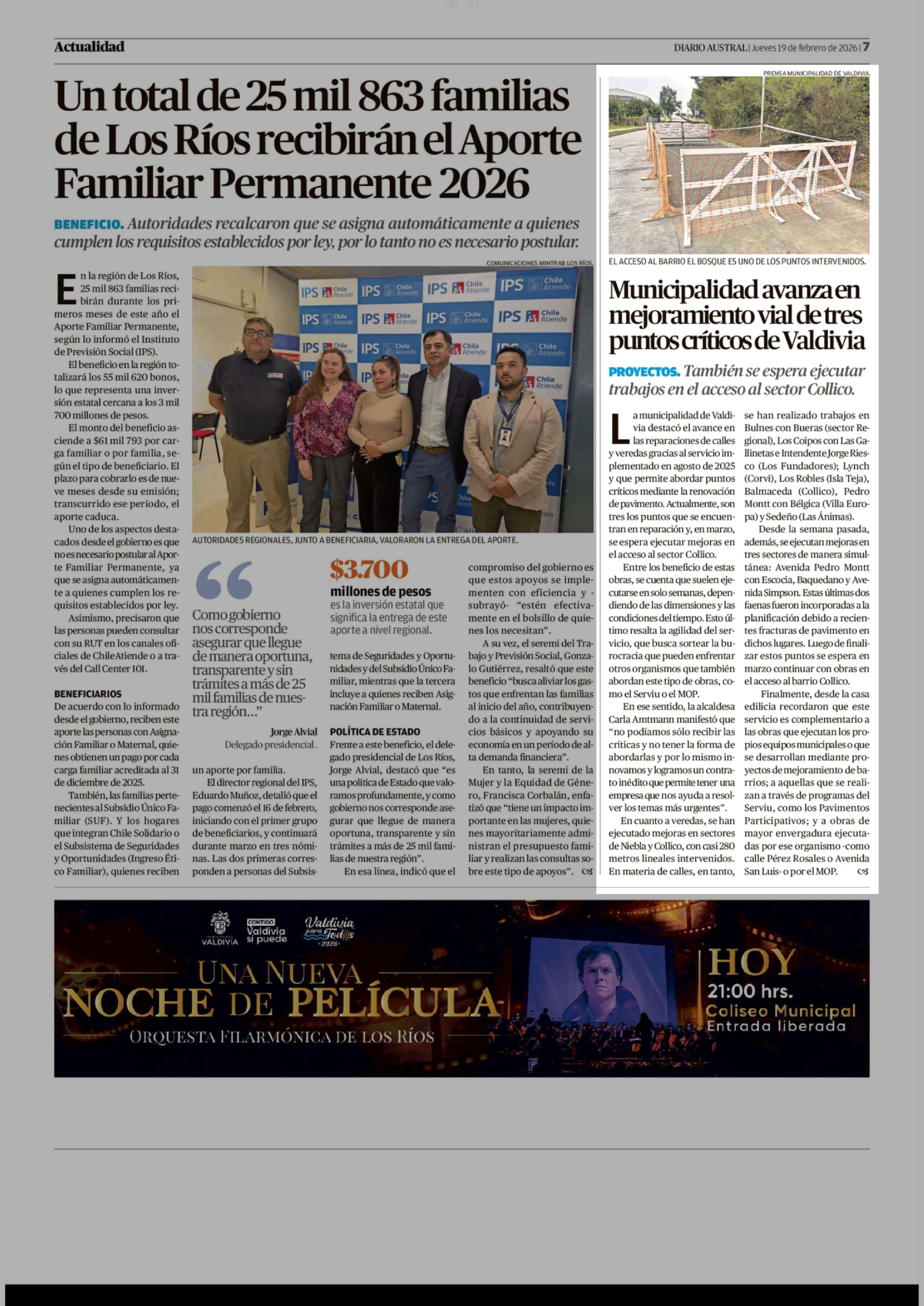 Municipalidad avanza en mejoramiento vial de tres puntos críticos de Valdivia 19-02-2026 Diario Austral Región de Los Ríos |