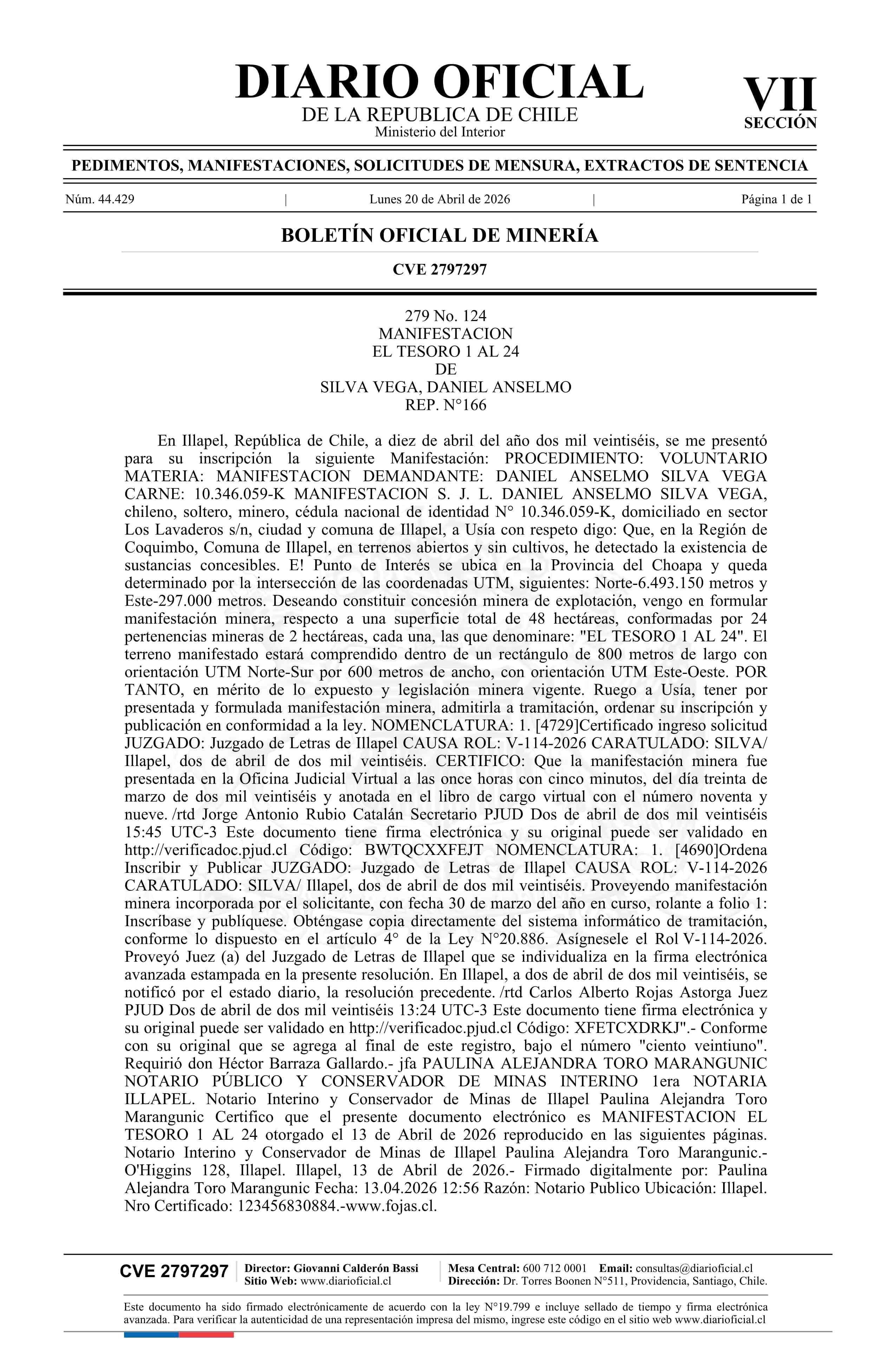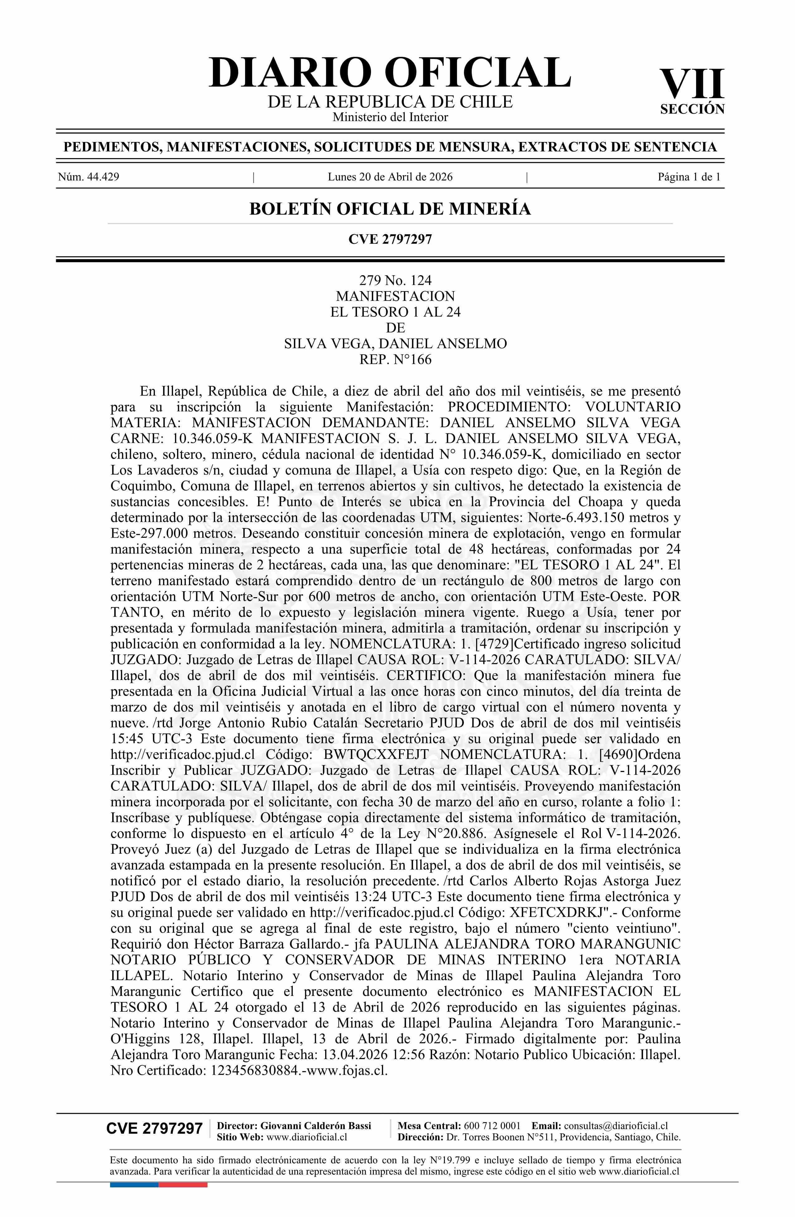 EL TESORO 1 AL 24 / Silva Vega Daniel Anselmo 20-04-2026 DIARIO OFICIAL CHILE - BOLETÍN OFICIAL DE MINERÍA |