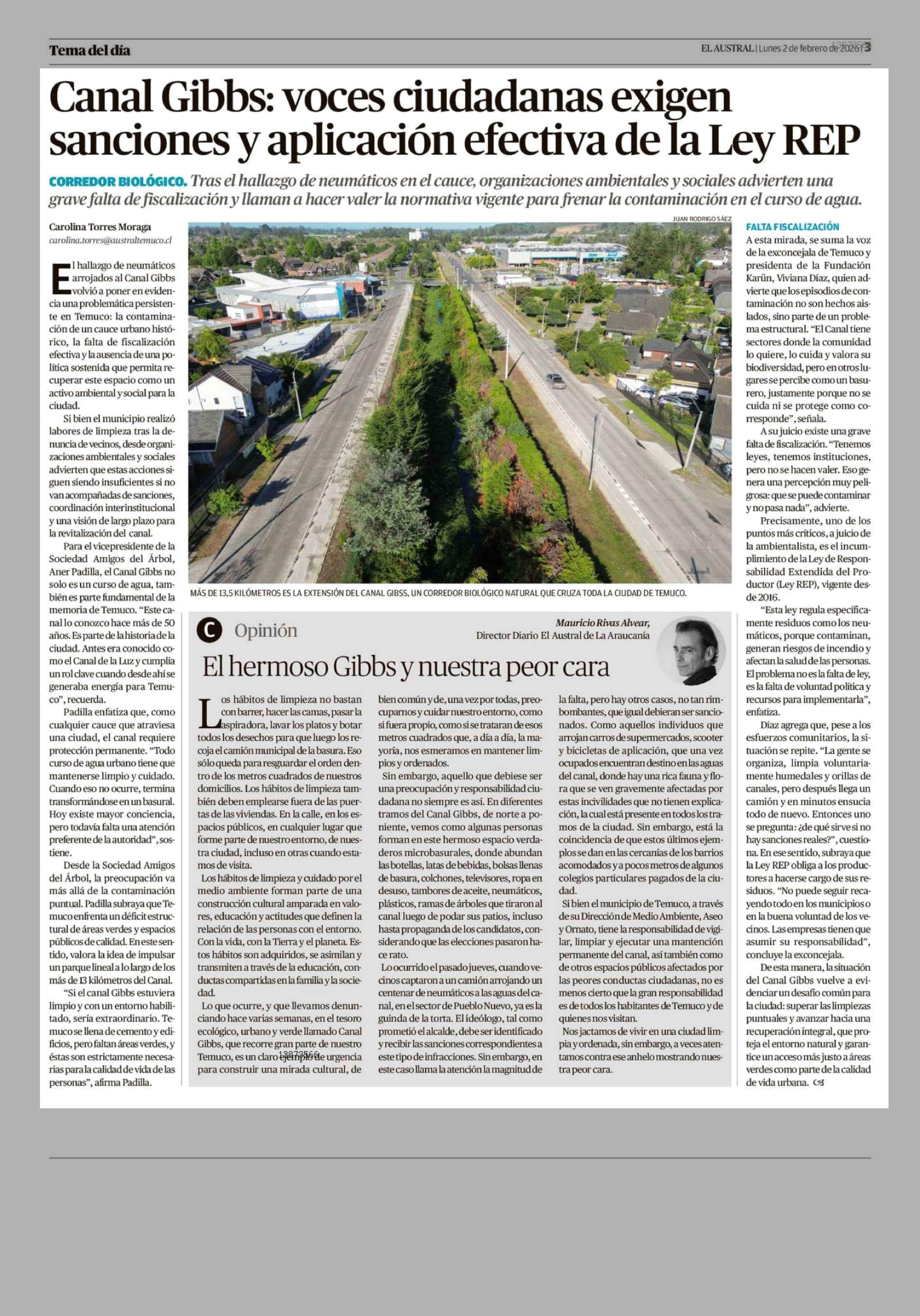 Canal Gibbs: voces ciudadanas exigen sanciones y aplicación efectiva de la Ley REP 02-02-2026 El Austral de la Araucanía |