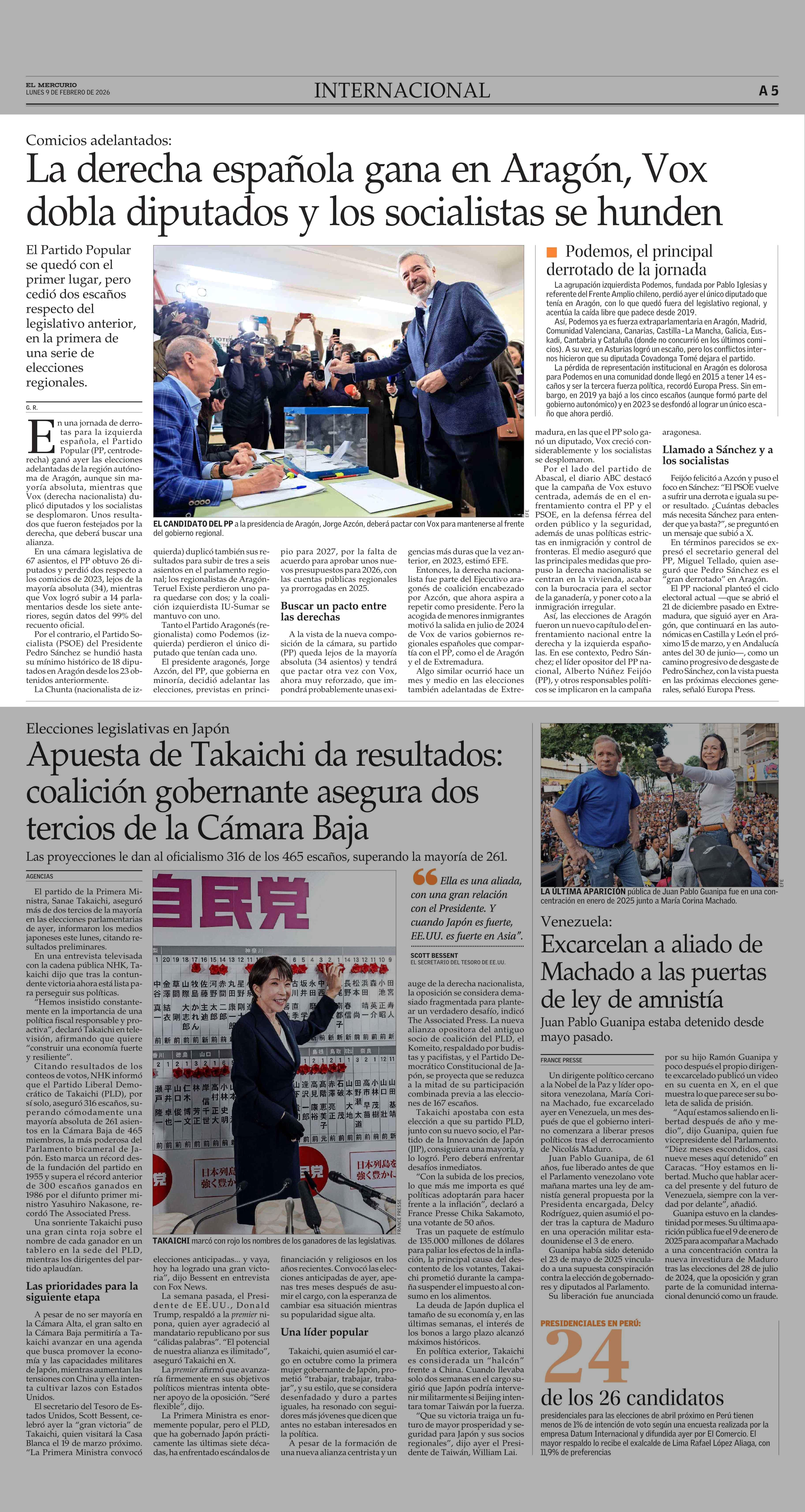 La derecha española gana en Aragón, Vox dobla diputados y los socialistas se hunden 09-02-2026 El Mercurio |