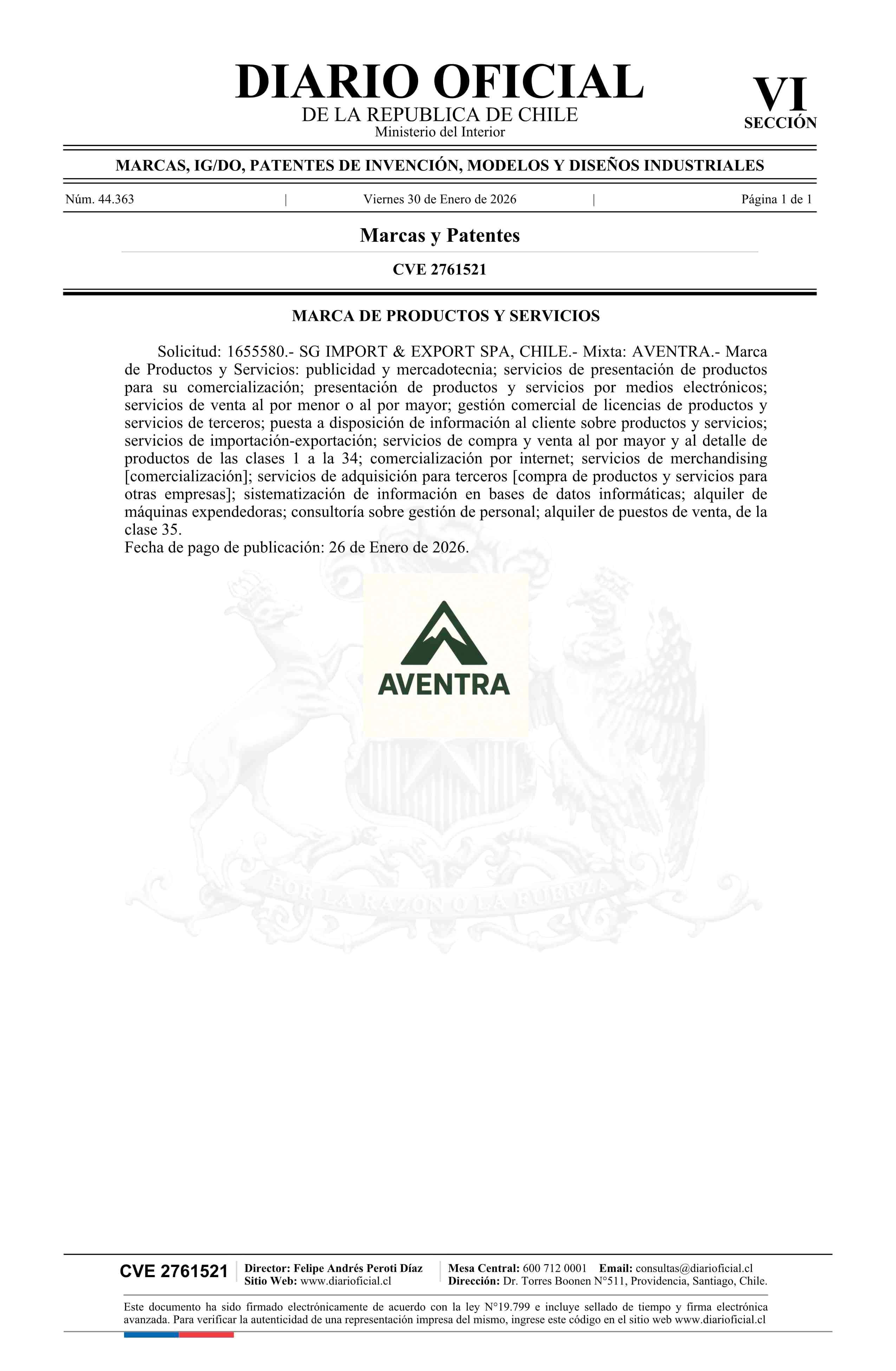 Solicitud número 1655580.- AVENTRA 30-01-2026 Diario Oficial Edición Electrónica |