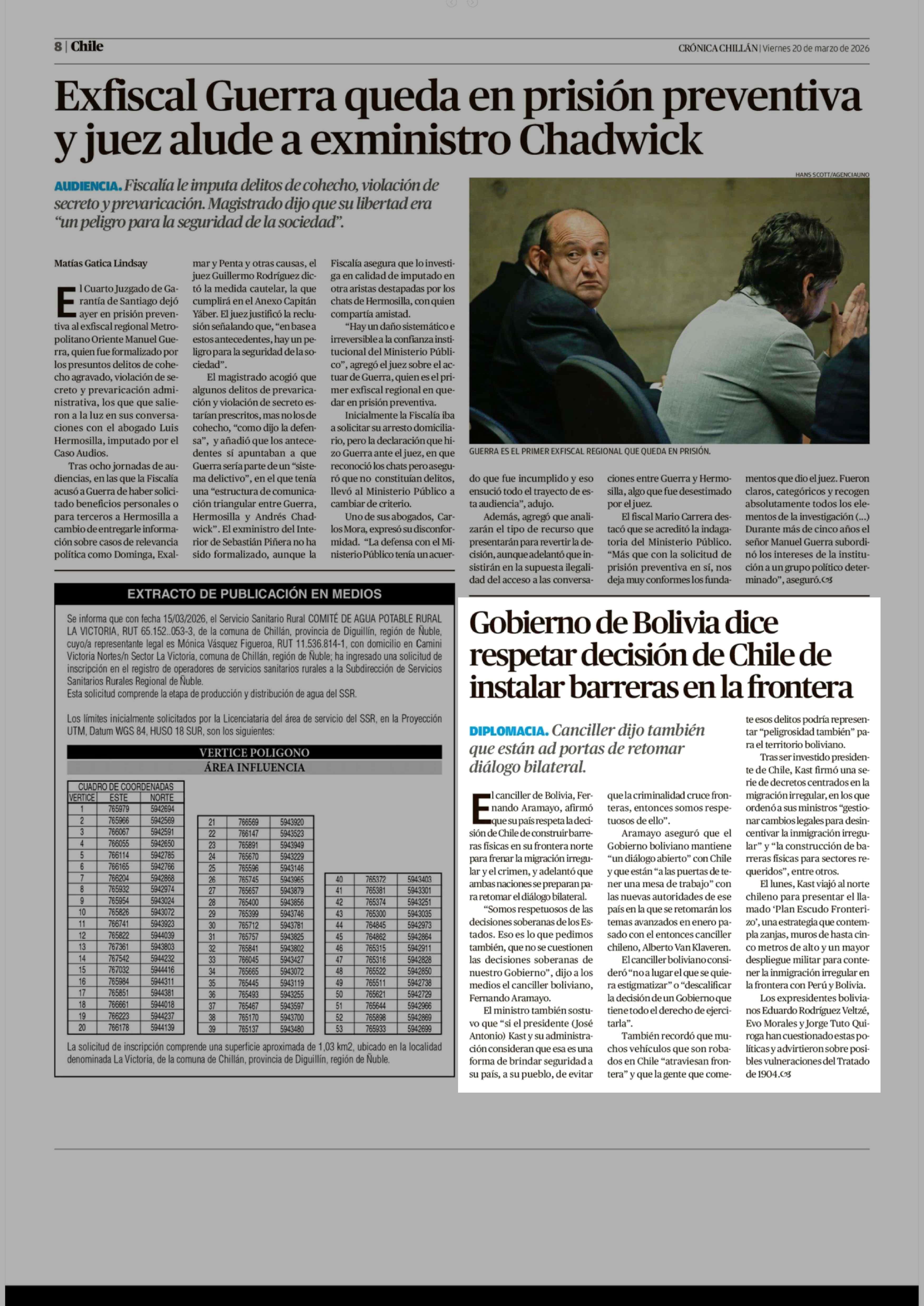 Gobierno de Bolivia dice respetar decisión de Chile de instalar barreras en la frontera 20-03-2026 Crónica de Chillán |