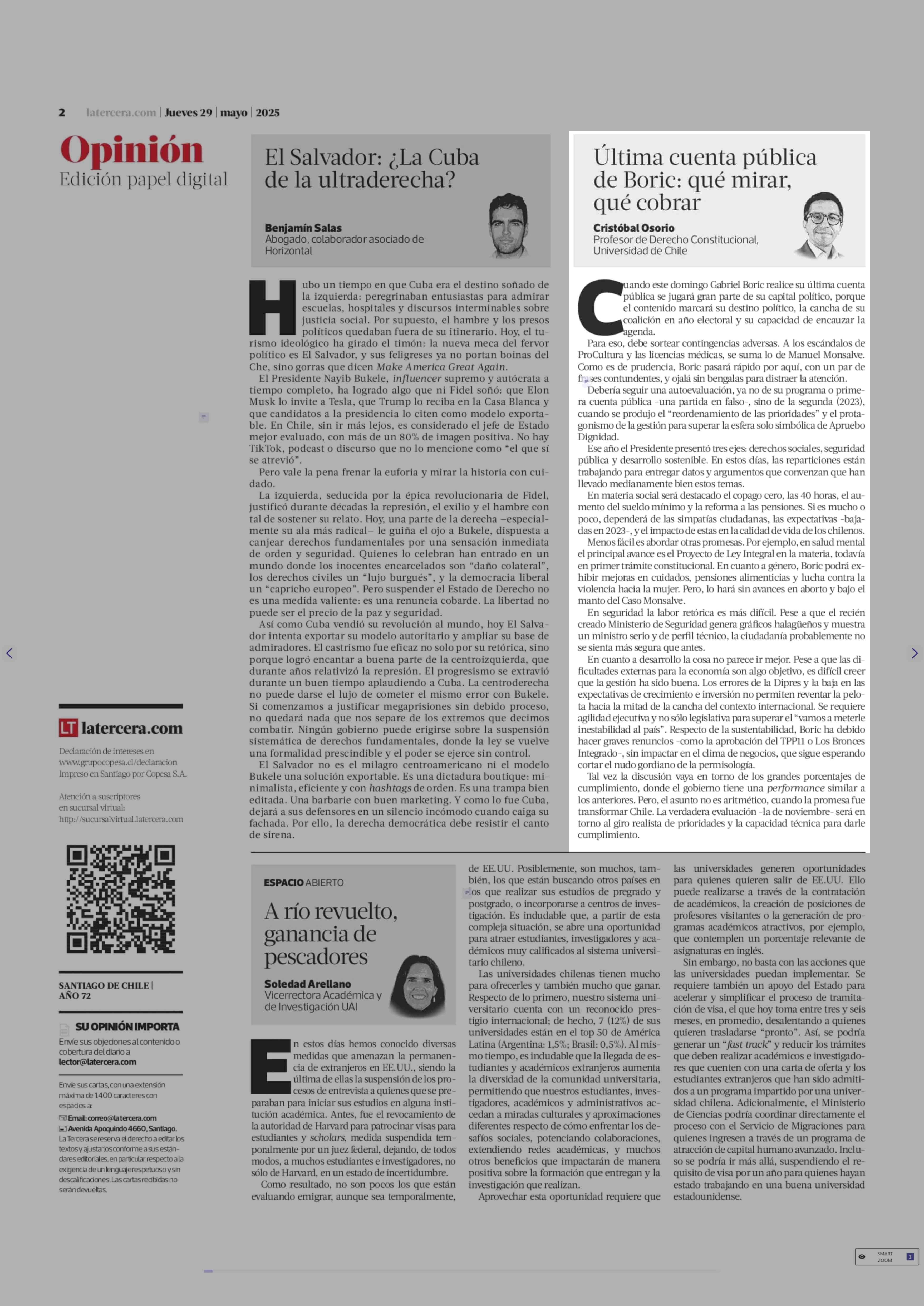 Columnas de Opinión: Última cuenta pública de Boric: qué mirar, qué cobrar 29-05-2025 La Tercera |