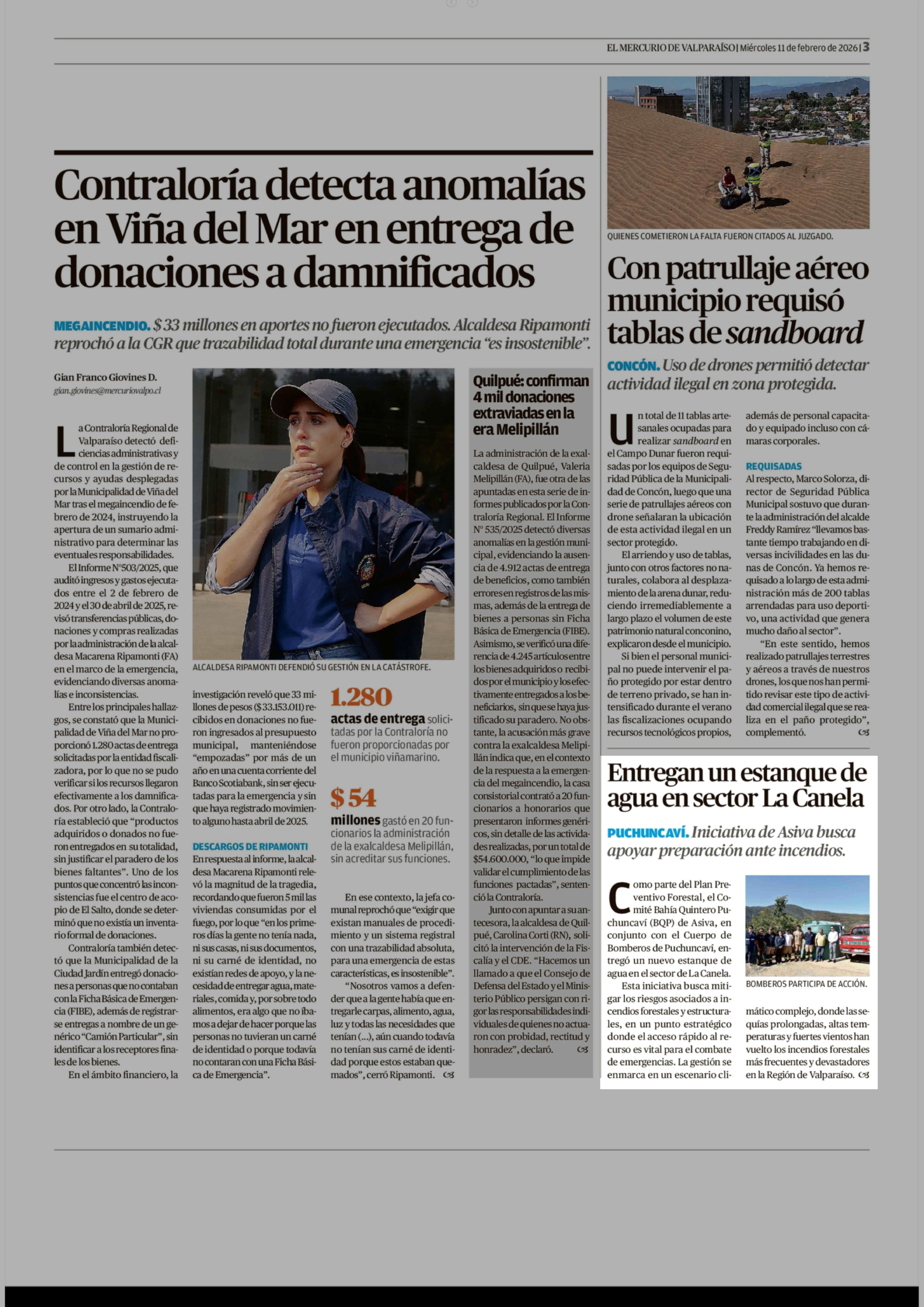 Entregan un estanque de agua en sector La Canela 11-02-2026 El Mercurio de Valparaíso |