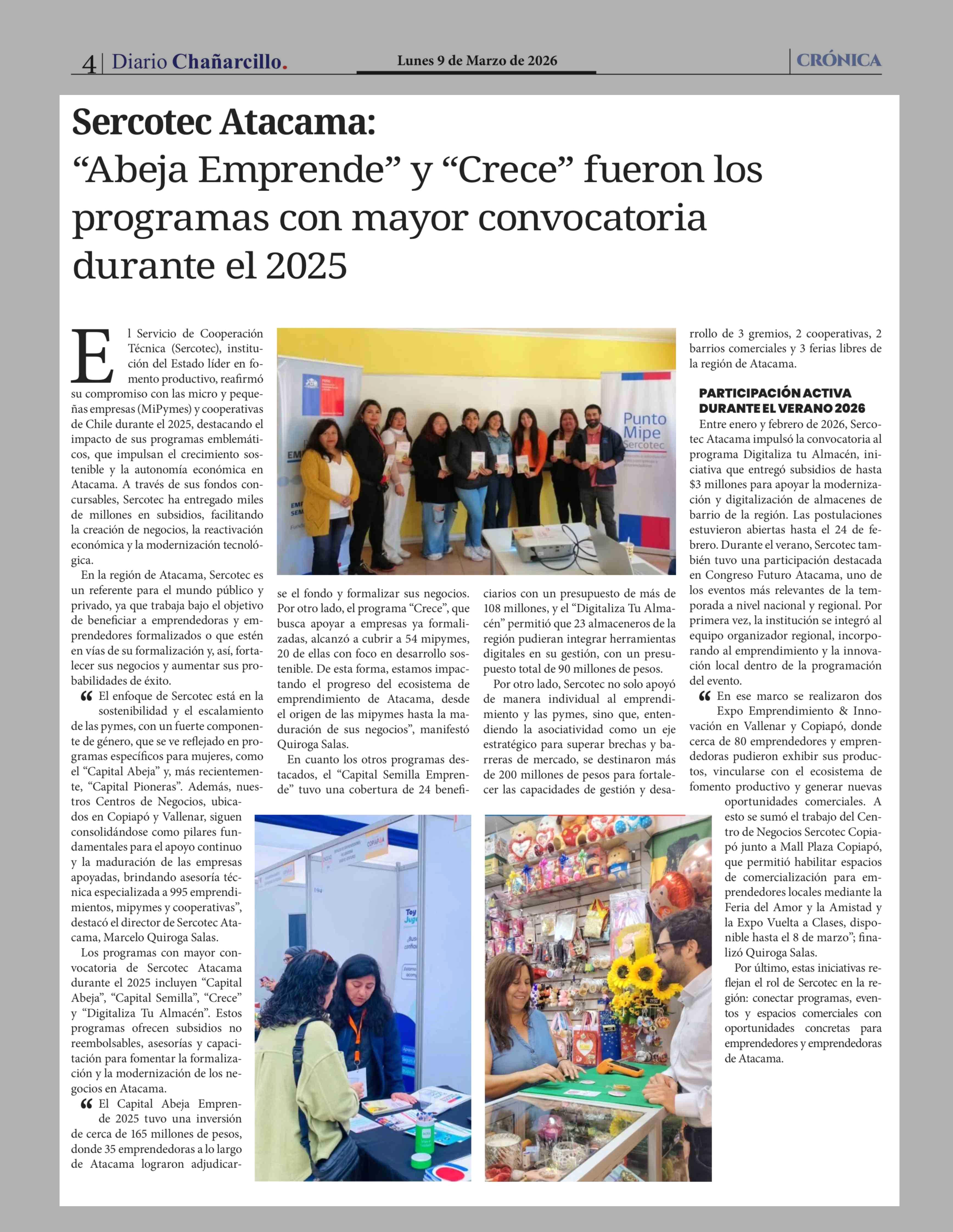 Título: Sercotec Atacama: "Abeja Emprende" y "Crece" fueron los programas con mayor convocatoria durante el 2025