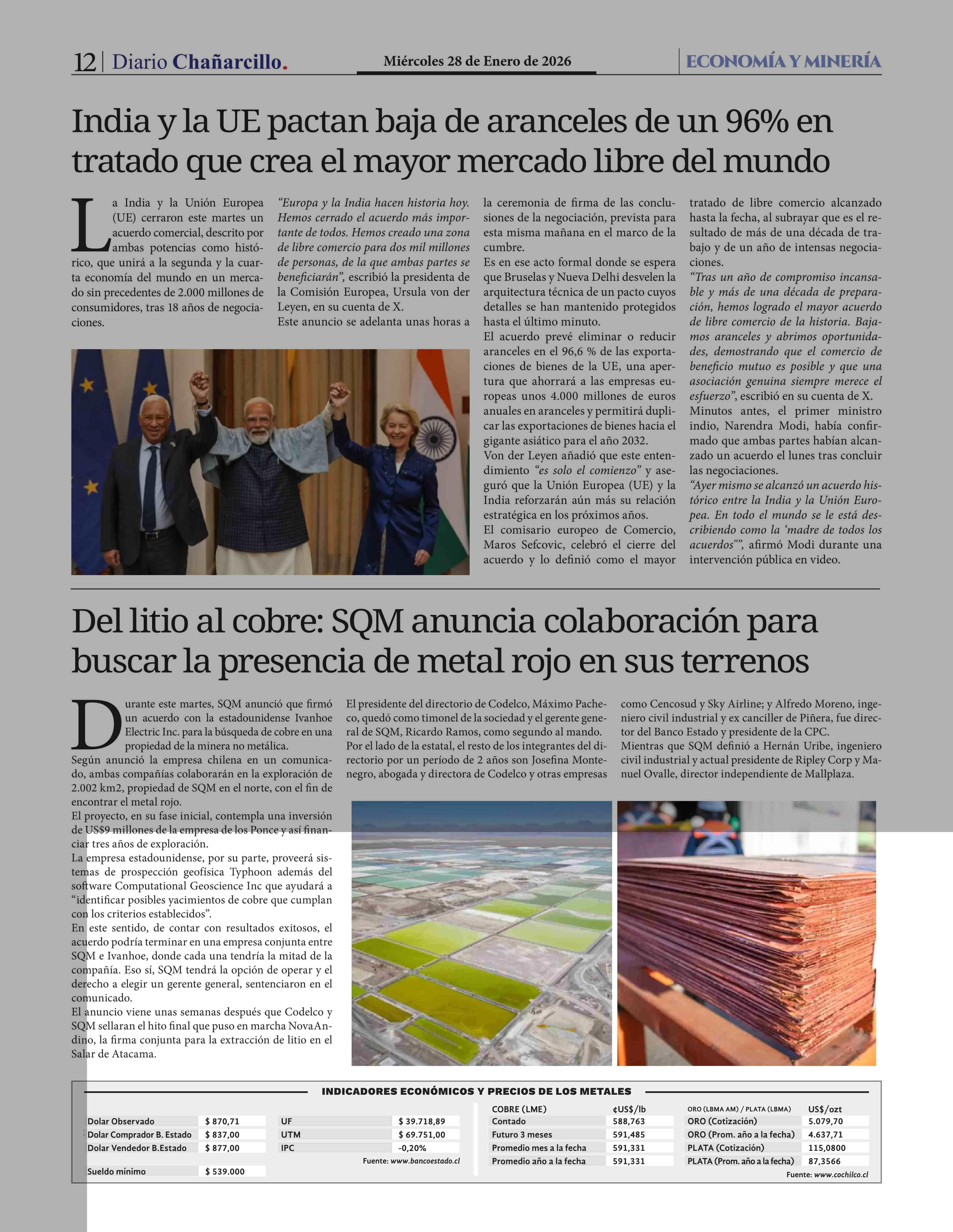 Del litio al cobre: SQM anuncia colaboración para buscar la presencia de metal rojo en sus terrenos 28-01-2026 Diario Chañarcillo |