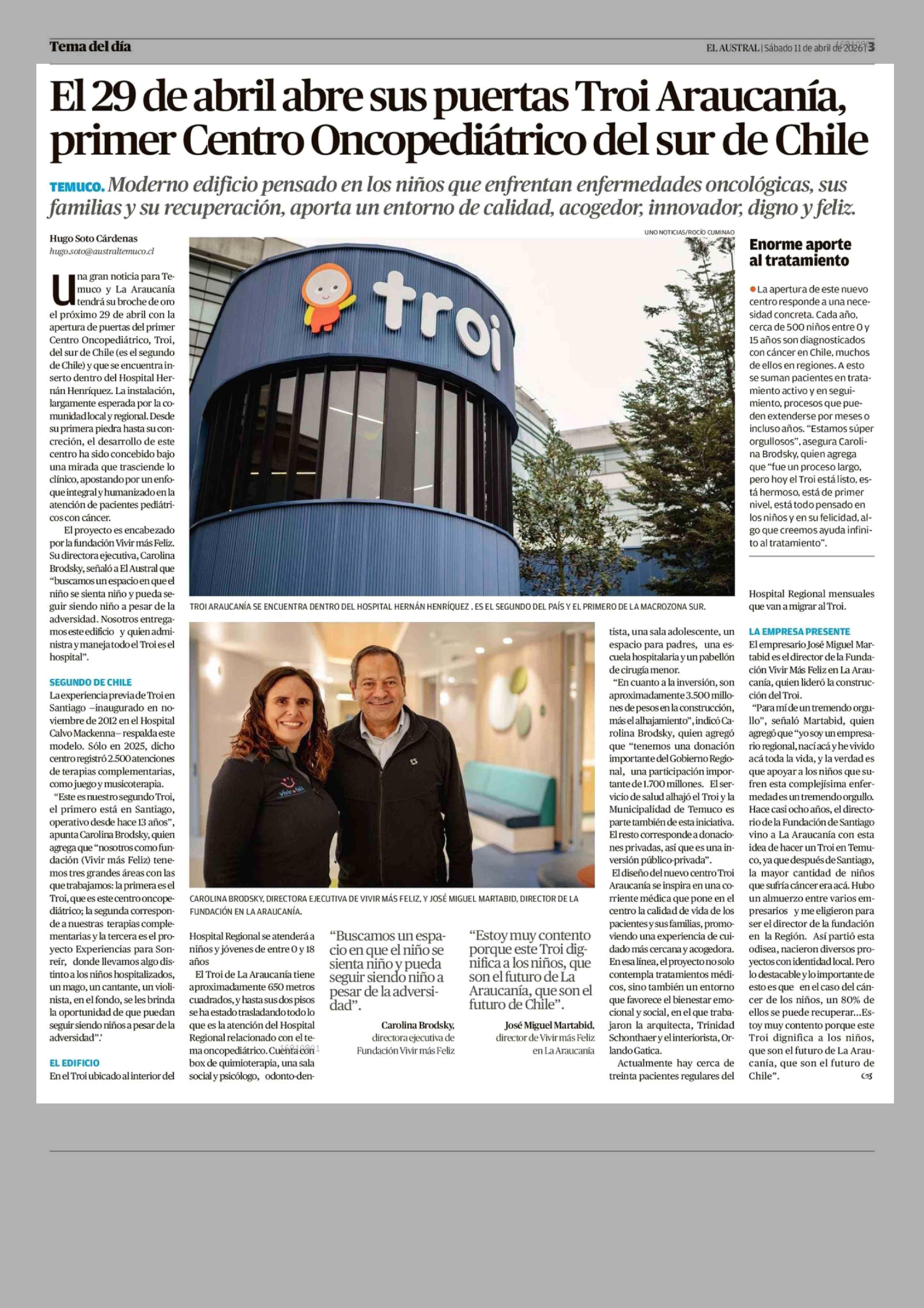 El 29 de abril abre sus puertas Troi Araucanía, primer Centro Oncopediátrico del sur de Chile 11-04-2026 El Austral de la Araucanía |