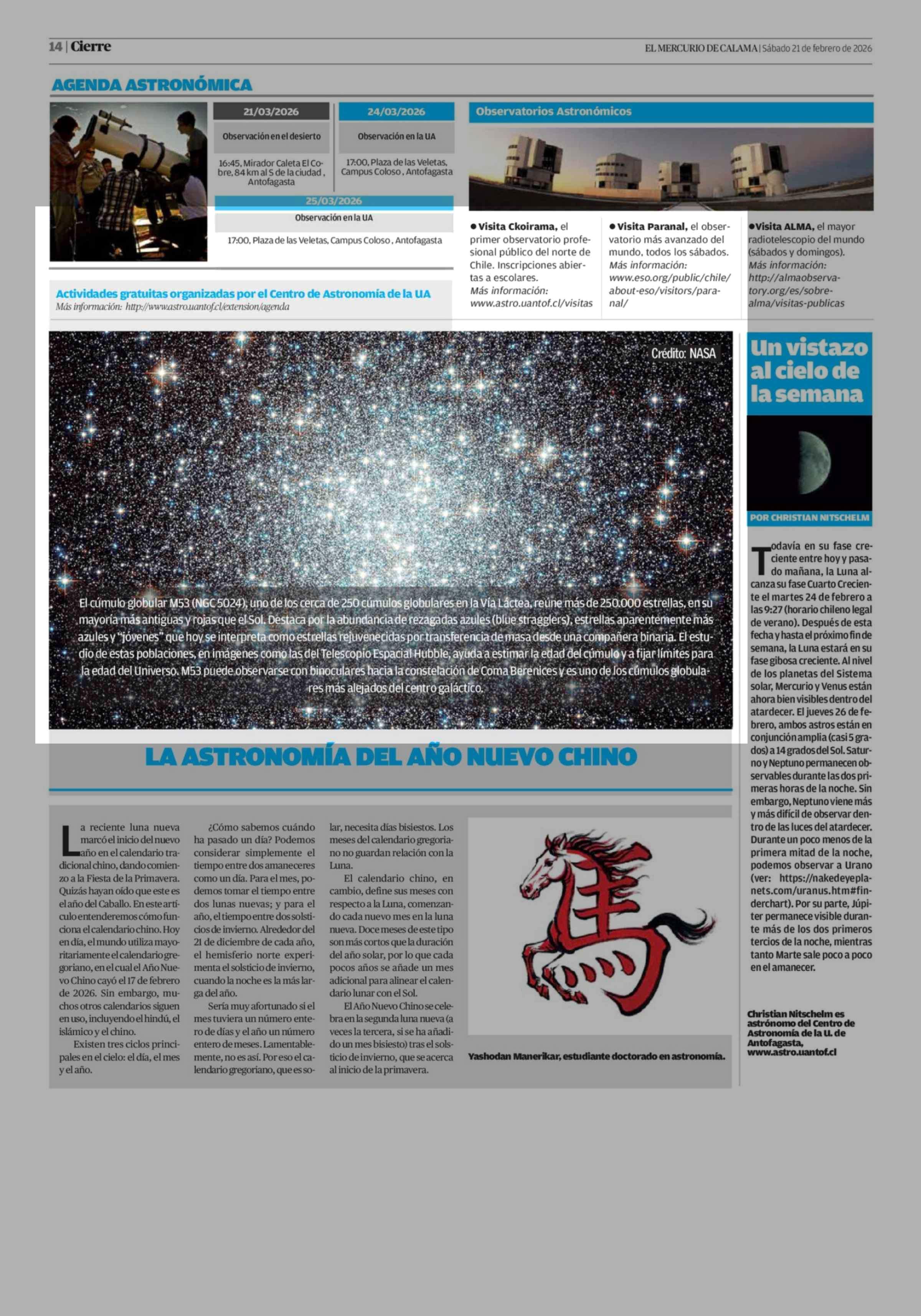 Actividades gratuitas organizadas por el Centro de Astronomía de la UA Más información: http://www.astro.uantof.cl/extension/agenda 21-02-2026 El Mercurio de Calama |