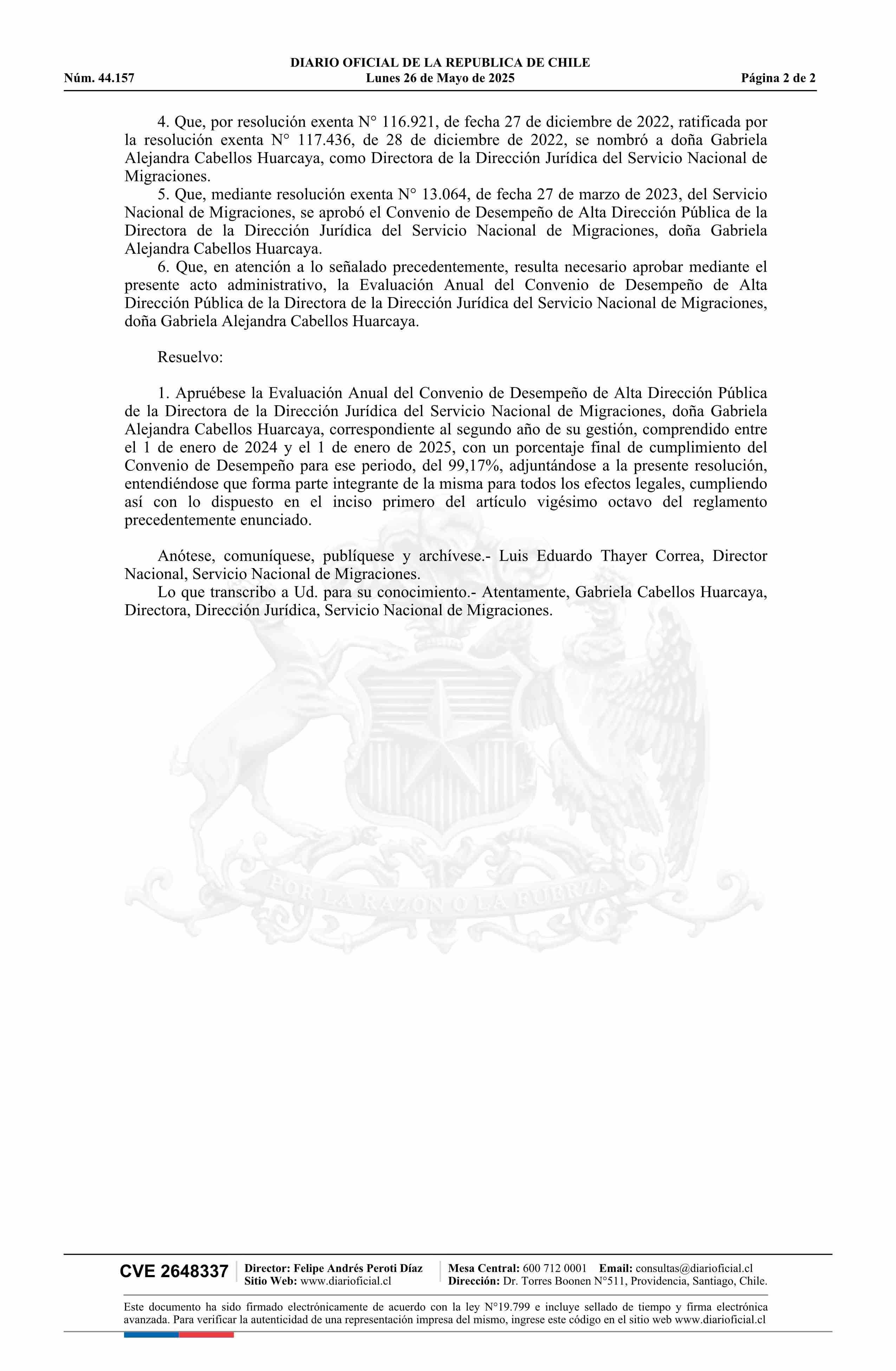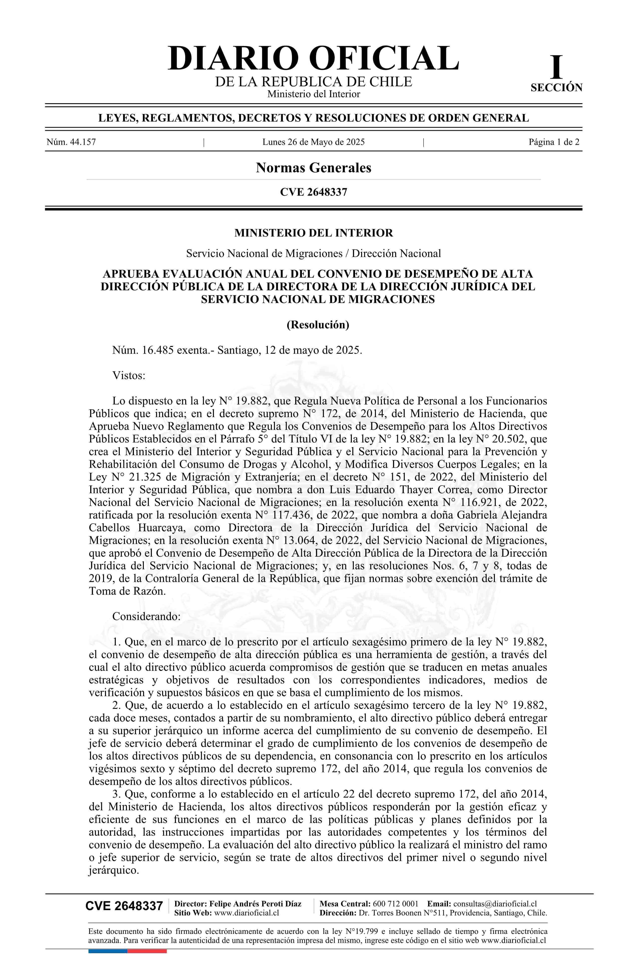 Resolución exenta número 16.485, de 2025.- Aprueba Evaluación Anual del Convenio de Desempeño de Alta Dirección Pública de la Directora de la Dirección Jurídica 26-05-2025 Diario Oficial Edición Electrónica |