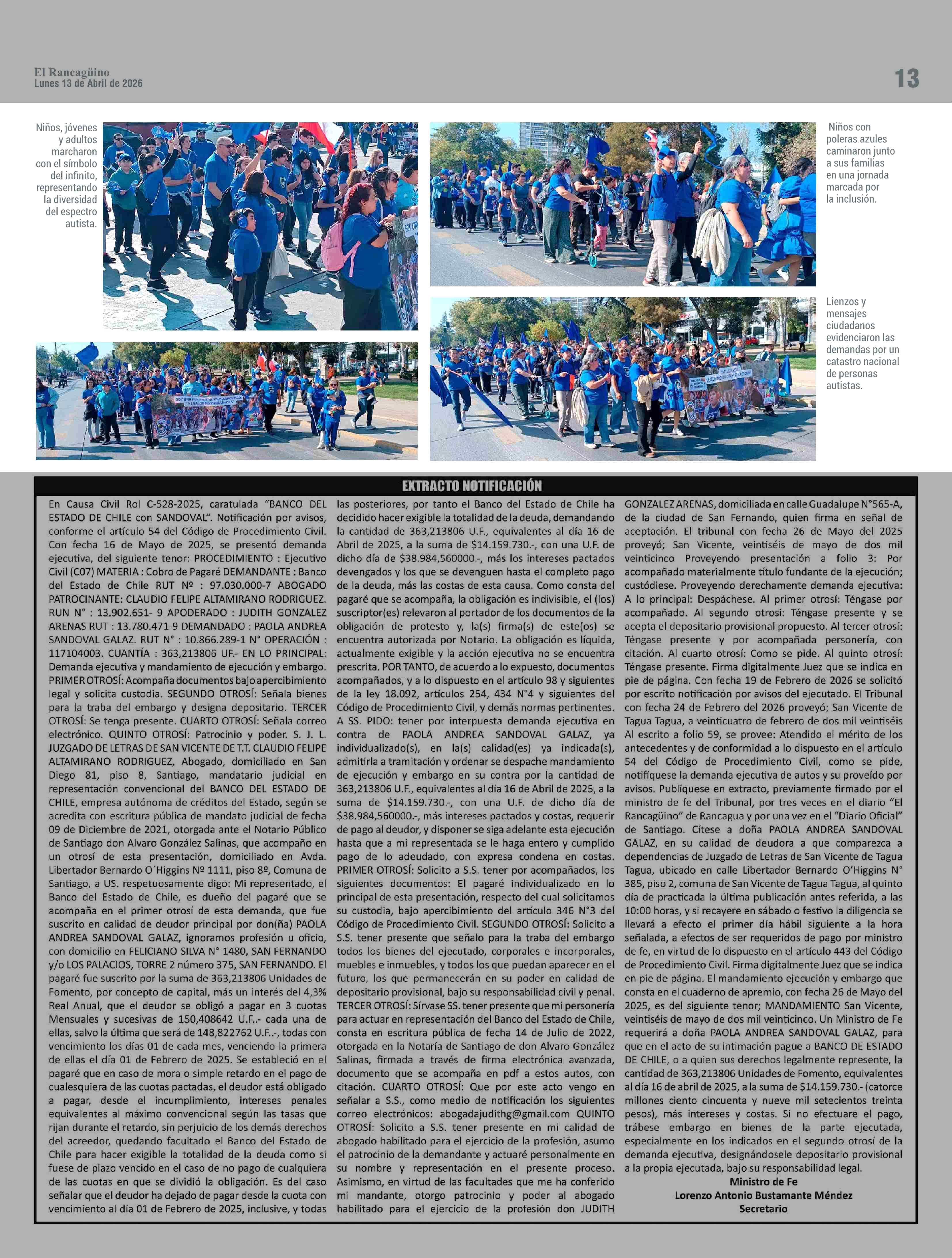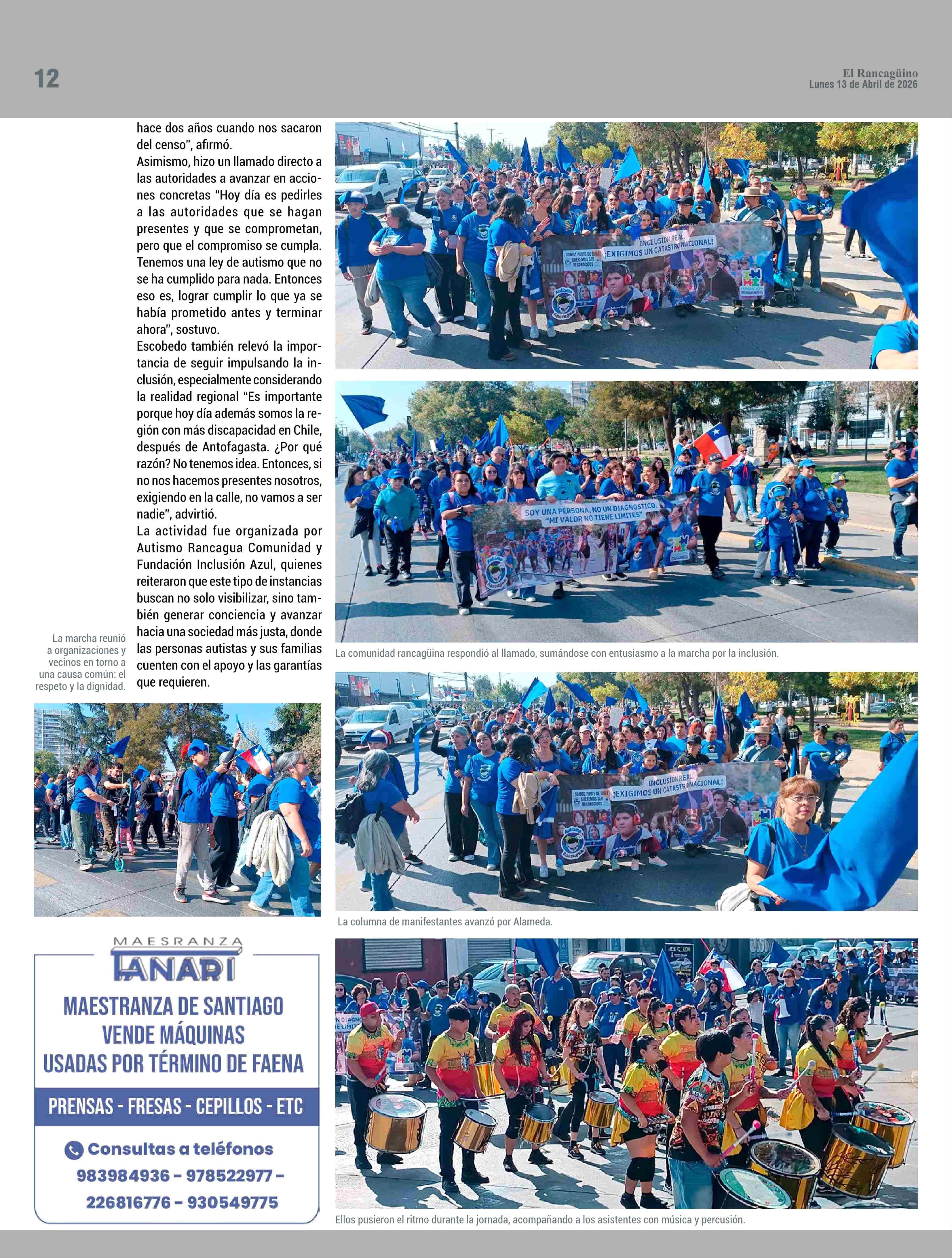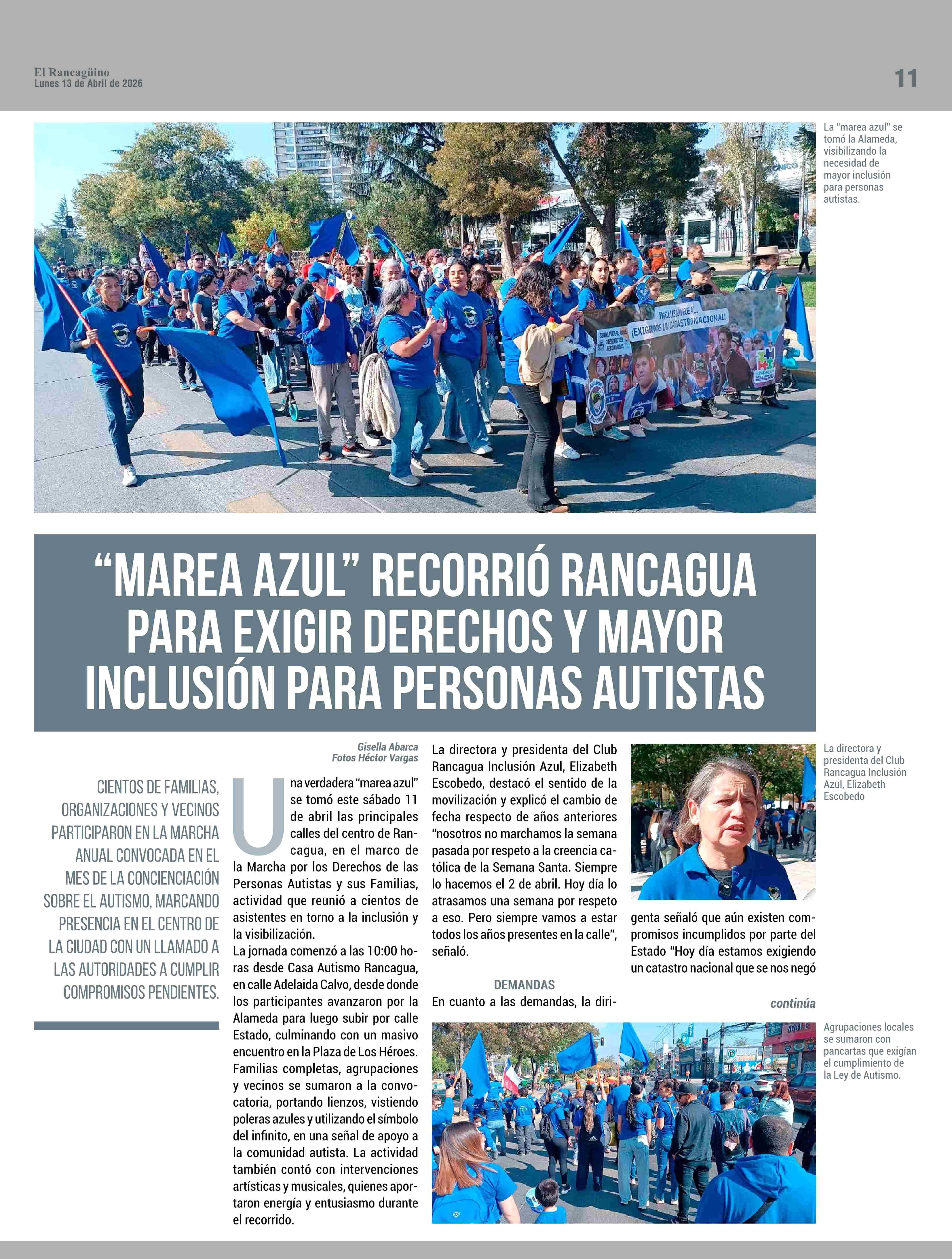 “MAREA AZUL” RECORRIÓ RANCAGUA PARA EXIGIR DERECHOS Y MAVOR INCLUSION PARA PERSONAS AUTISTAS 13-04-2026 El Rancagüino |