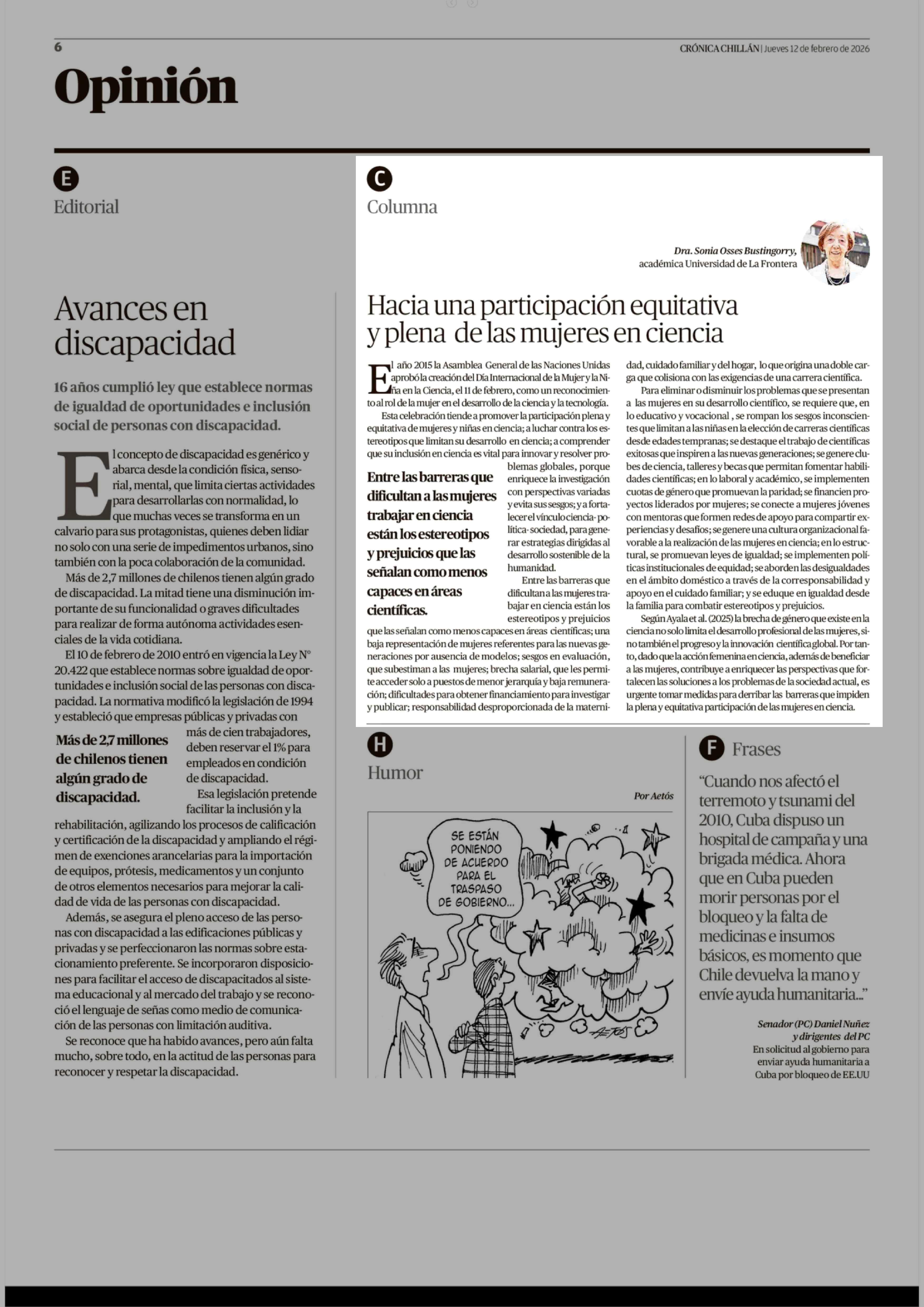 Columnas de Opinión: Hacia una participación equitativa y plena de las mujeres en ciencia 12-02-2026 Crónica de Chillán |