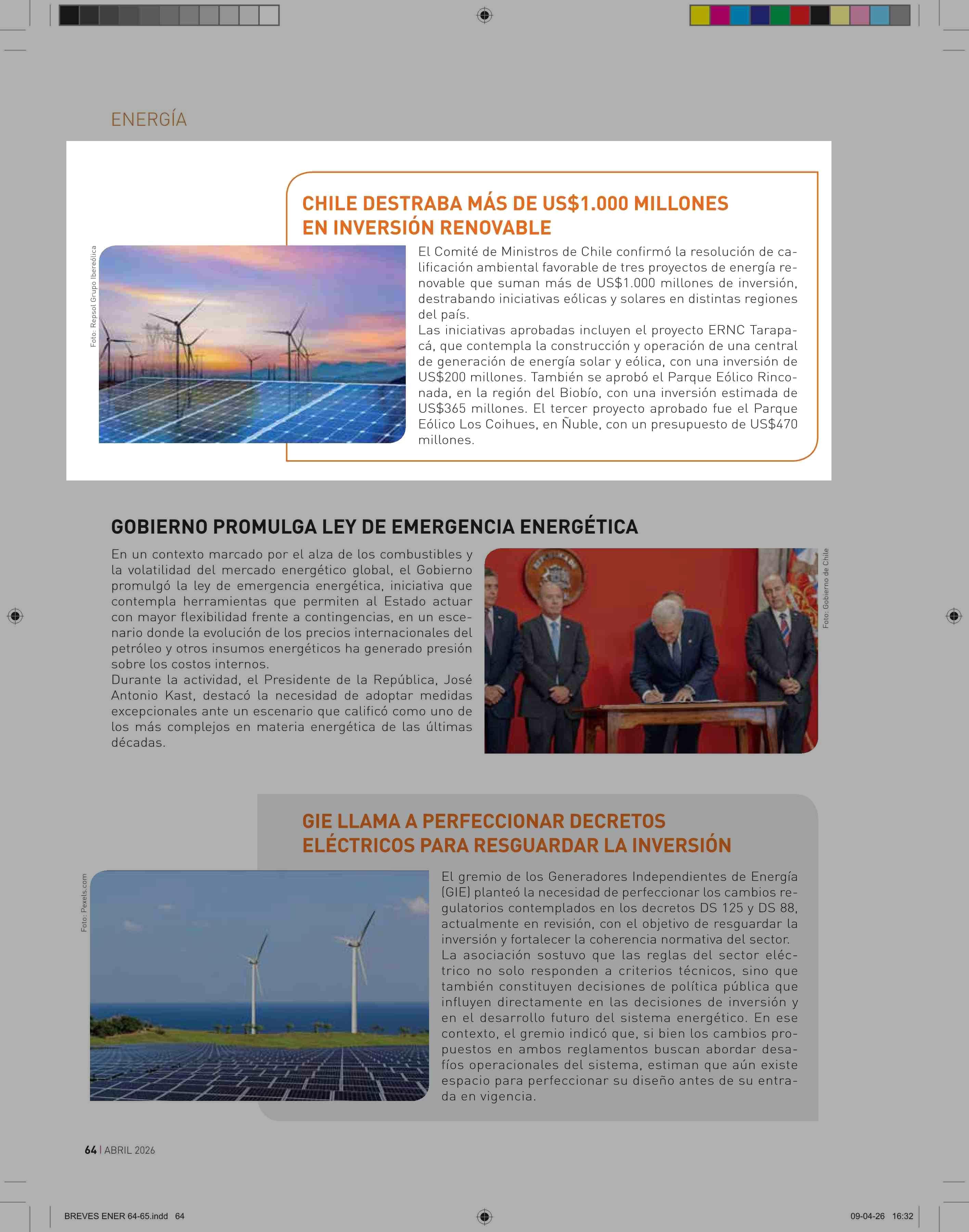 CHILE DESTRABA MÁS DE US$1.000 MILLONES EN INVERSION RENOVABLE 15-04-2026 Revista Nueva Minería & Energía |