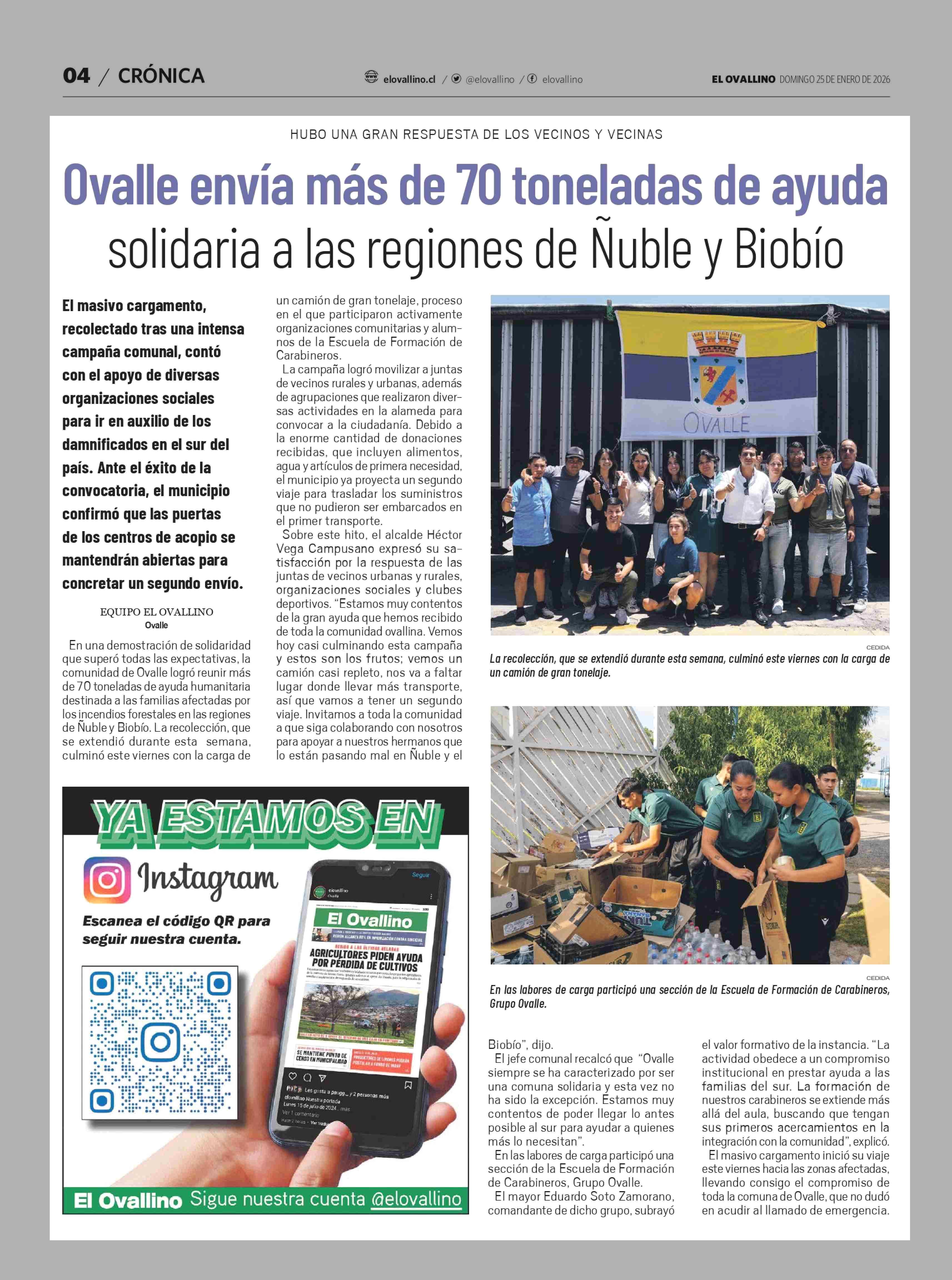 Ovalle envía más de 70 toneladas de ayuda solidaria a las regiones de Nuble y Biobío 25-01-2026 El Ovallino |
