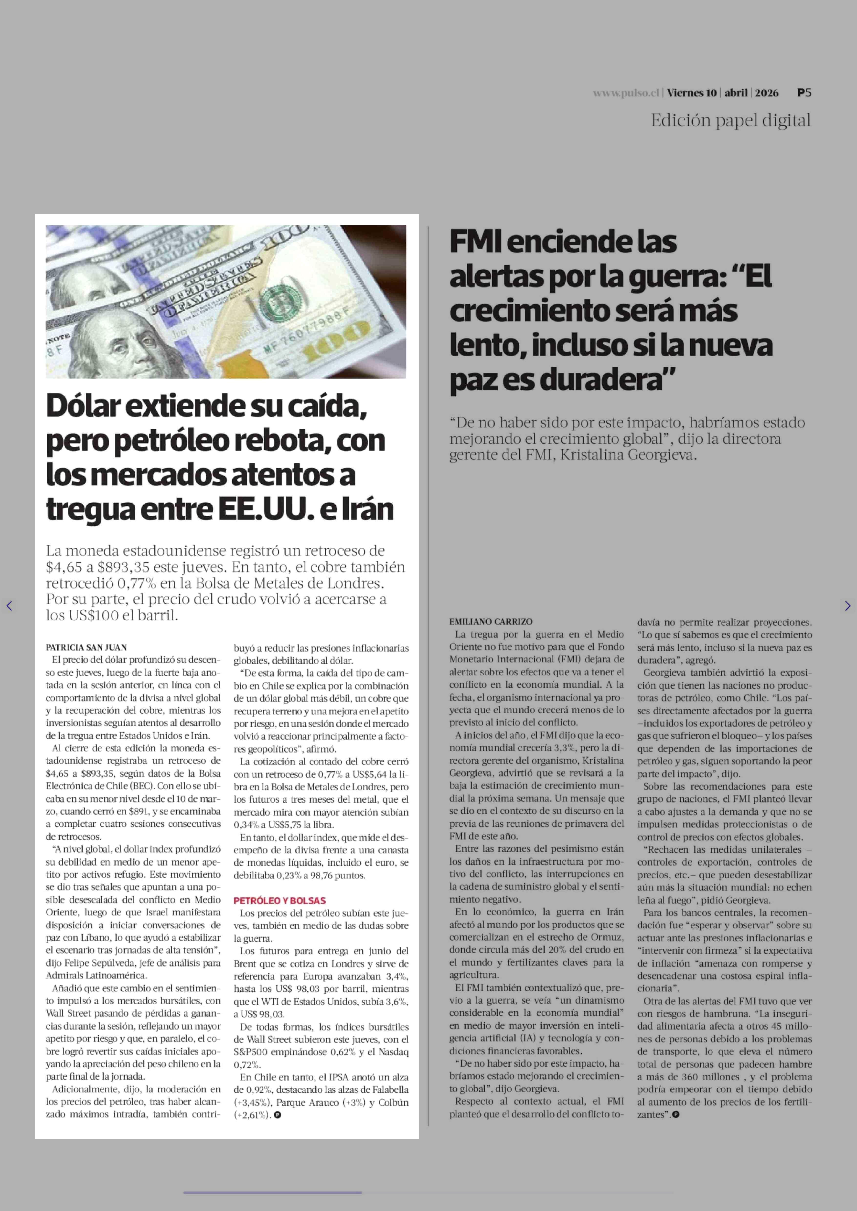Dólar extiende su caída, pero petróleo rebota, con los mercados atentos a tregua entre EE.UU. e Irán 10-04-2026 La Tercera |