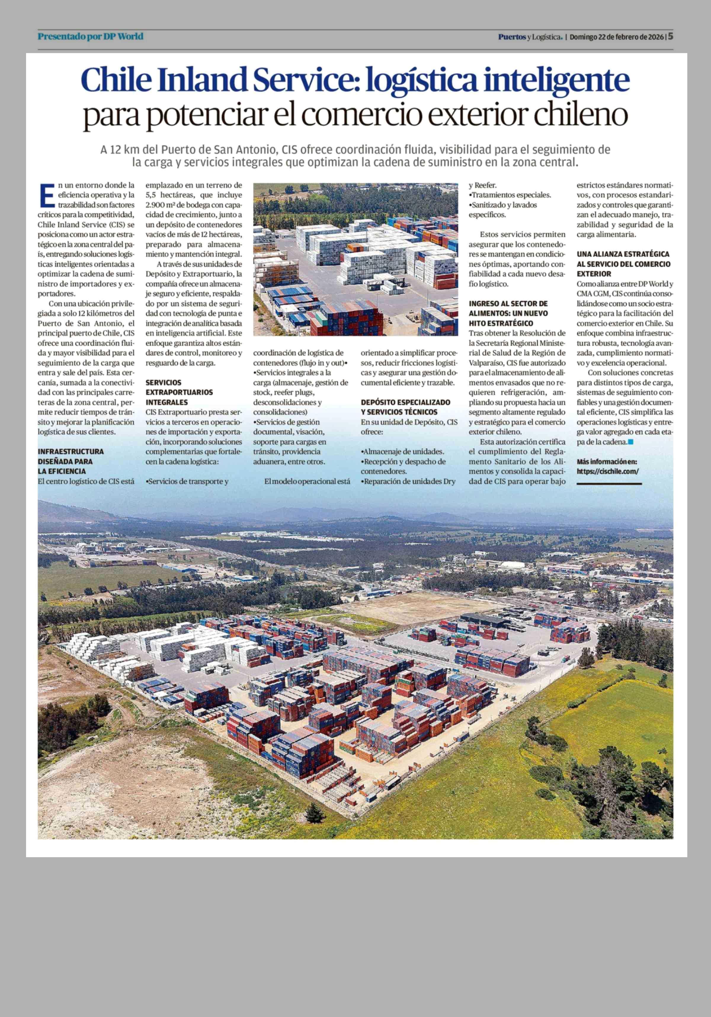 Chile Inland Service: logística inteligente para potenciar el comercio exterior chileno 22-02-2026 El Mercurio de Valparaíso |