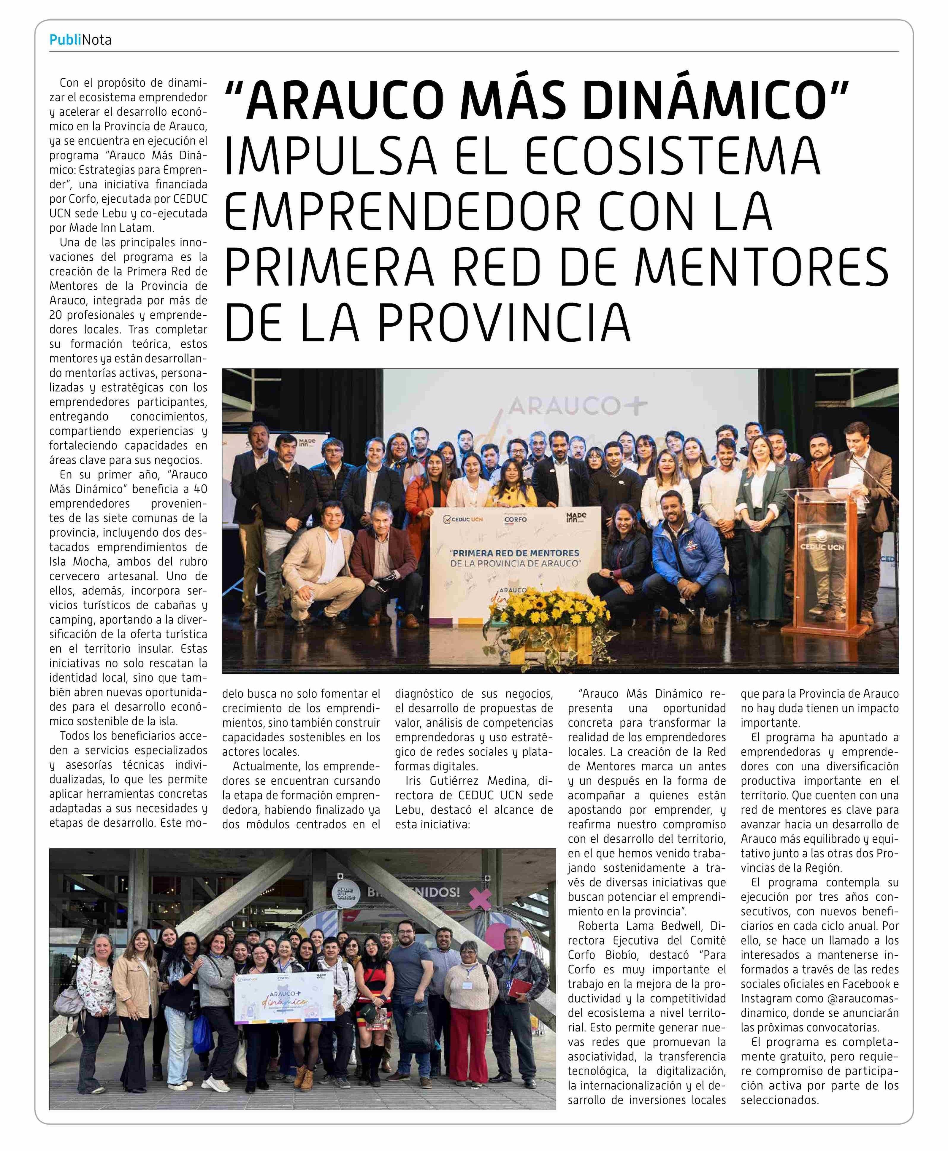 "ARAUCO MÁS DINÁMICO" IMPULSA EL ECOSISTEMA EMPRENDEDOR CON LA PRIMERA RED DE MENTORES DE LA PROVINCIA 30-05-2025 Diario Concepción |