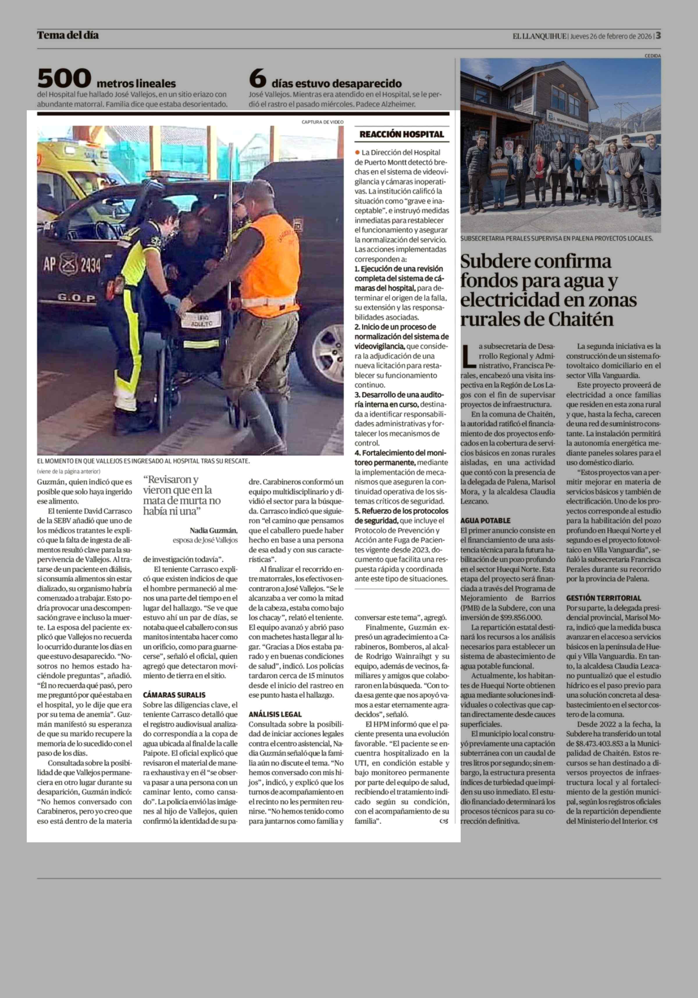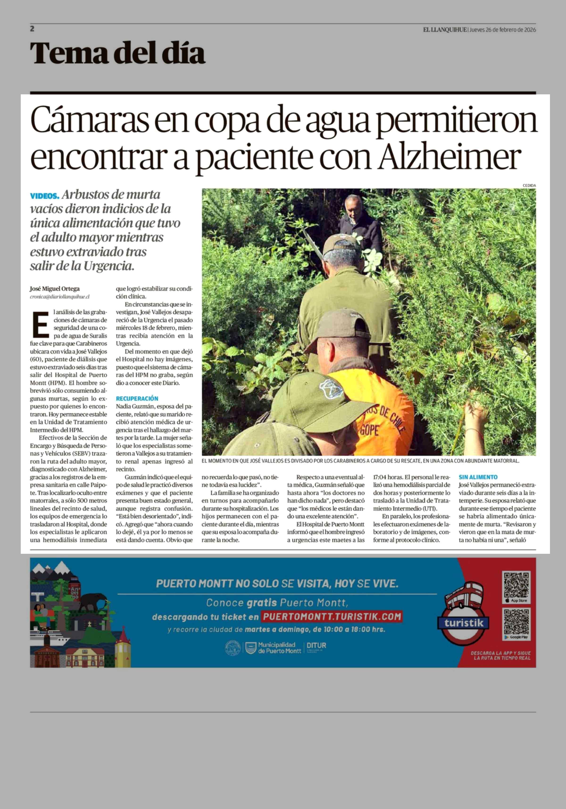 Cámaras en copa de agua permitieron encontrar a paciente con Alzheimer 26-02-2026 El Llanquihue |