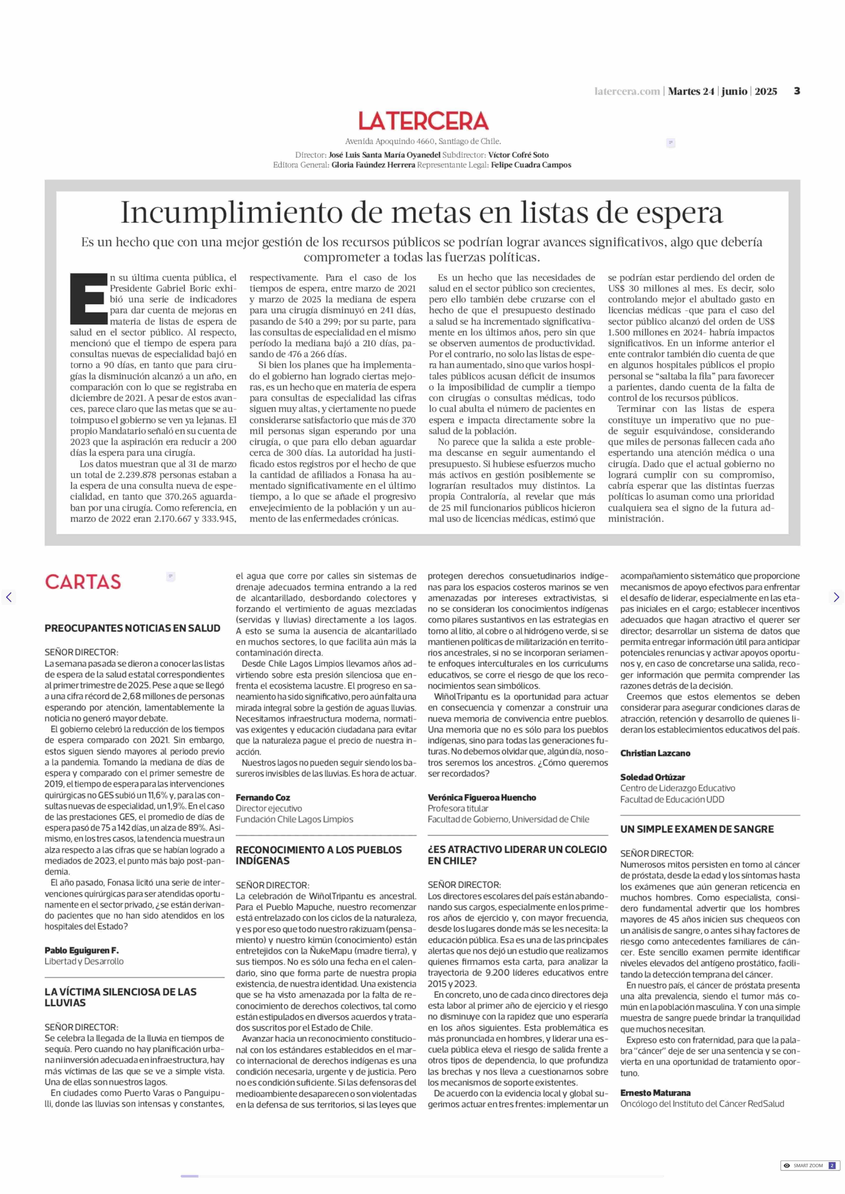 CARTAS: PREOCUPANTES NOTICIAS EN SALUD 24-06-2025 La Tercera |